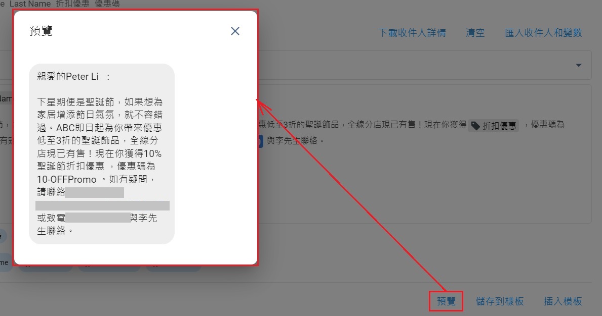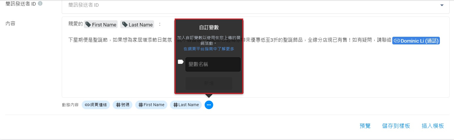 - 你可以在訊息內容裡,加入上載的變數。這些變數為自訂變數,會顯示在訊息內容底下。