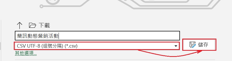 以CSV URF-8 (逗號分隔) (*.csv) 格式儲存檔案。
