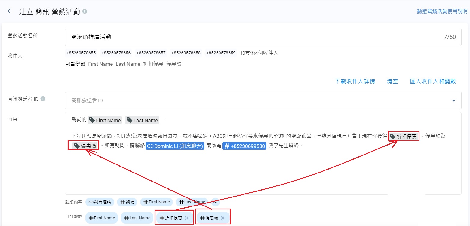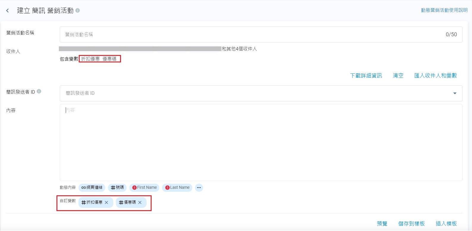 加入動態內容或自訂變數作為營銷活動的訊息內容