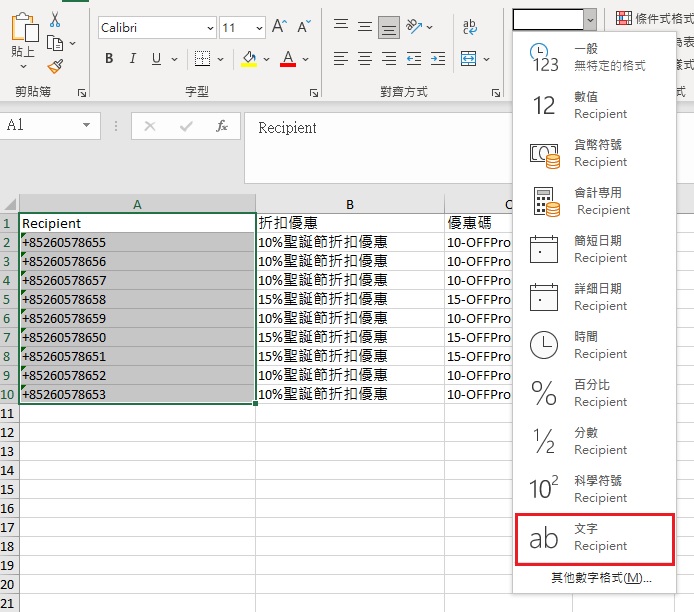 - 在收件人號碼(Recipients Number)的欄目上,加入收件人的電話號碼。電話號碼前應包括國家碼。