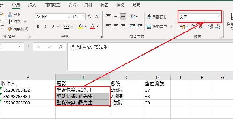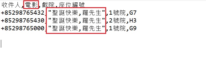 在含有逗號的文字加上開雙引號(“”),例如:“聖誕快樂, 羅先生” ,並將其檔案儲存為CSV檔案上載。