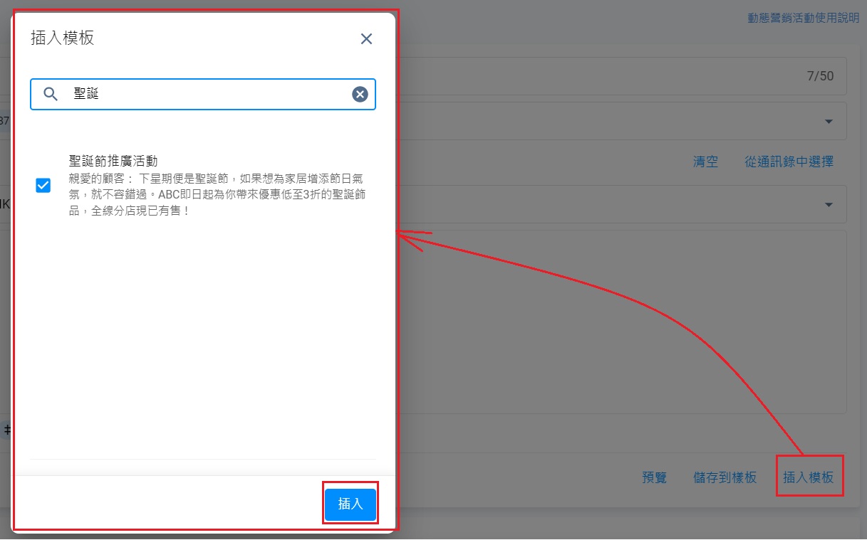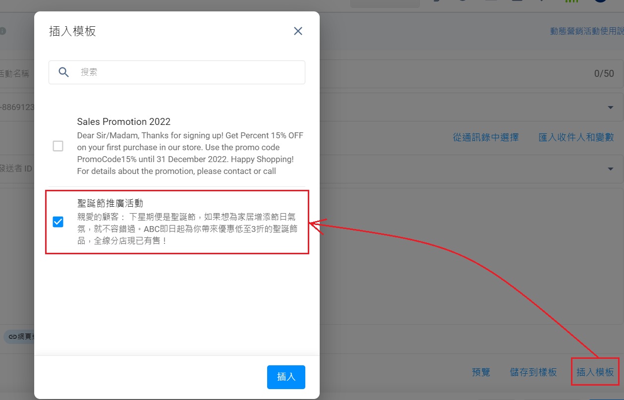 - 或者你可以點擊插入模板,輸入關鍵字,搜索合適模板作內容。更多關於模板的資料,可參考簡訊營銷活動模板。