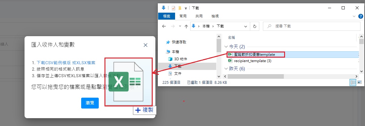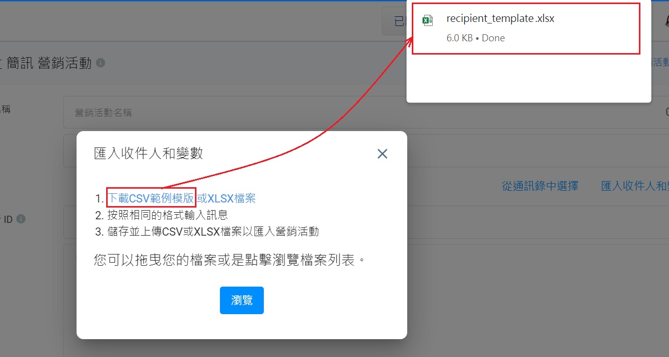 - 在彈出式視窗,點撃下載CSV範例模版或XLSX檔案,以下載模板。