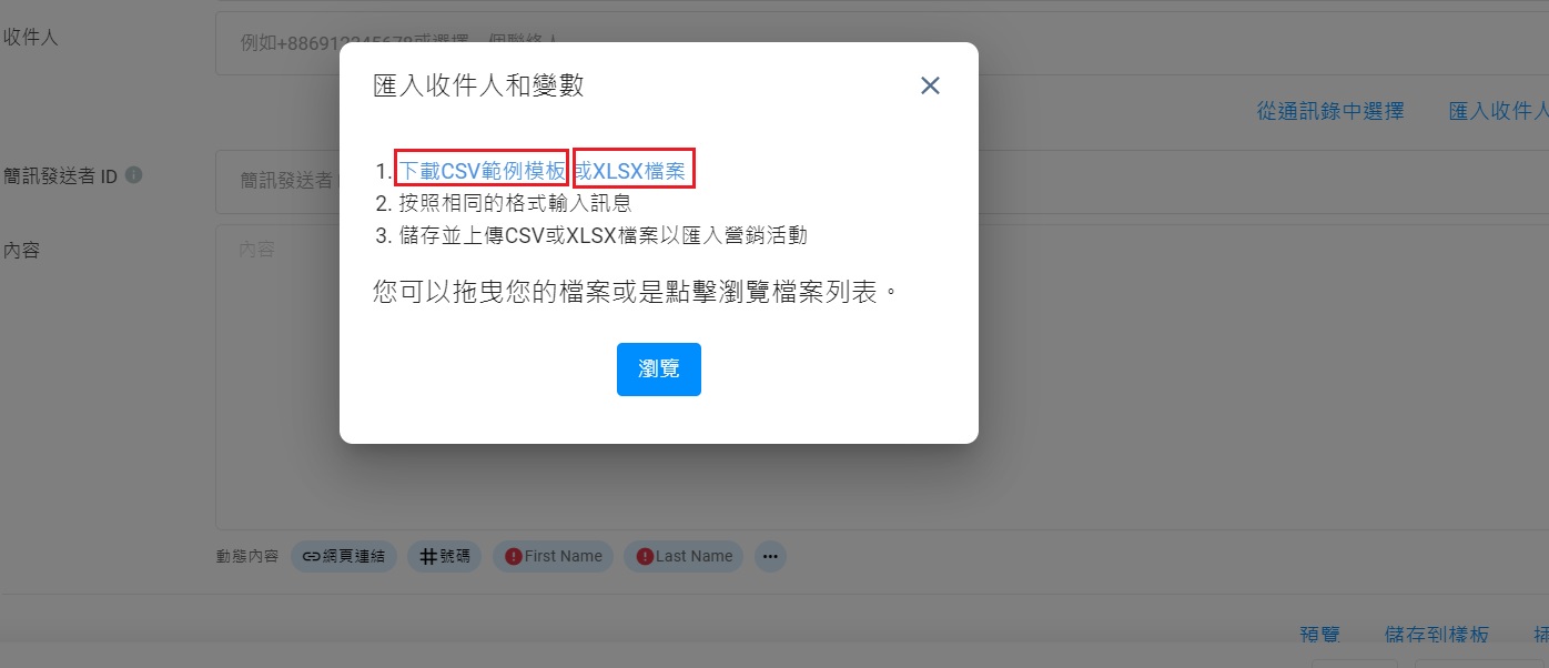 - 當輸入的文字分隔時,請參考建立簡訊動態營銷活動中,**如何處理CSV檔案的分隔文字**部份。
