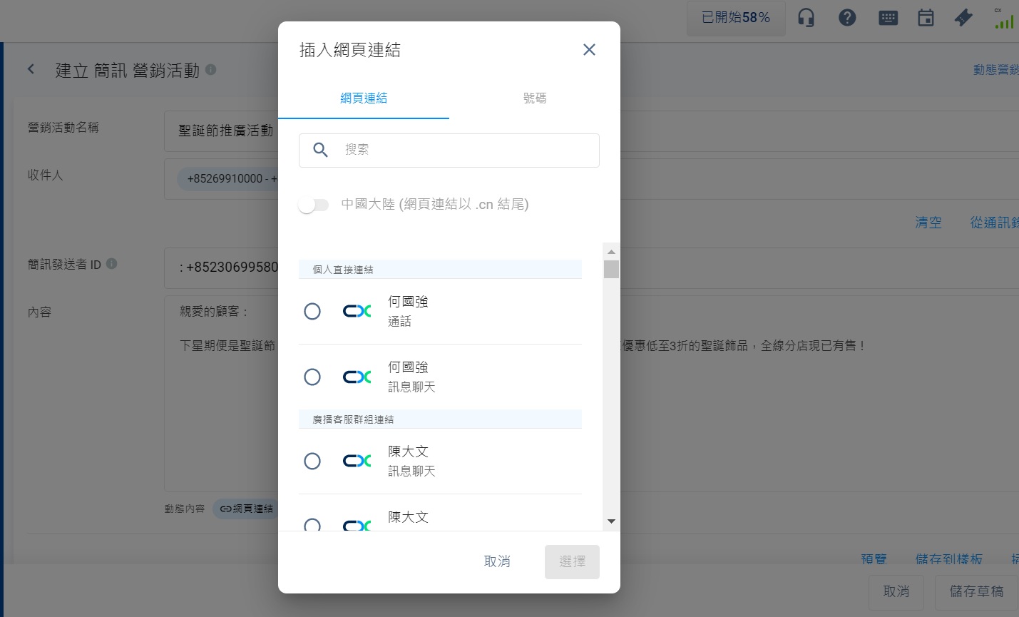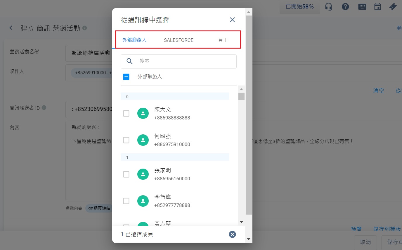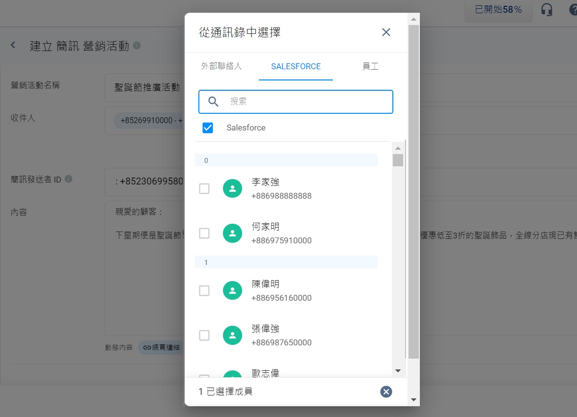 如你的Salesforce的通訊錄已經與CINNOX同步,可以從中選擇聯絡人,發送動態營銷活動簡訊予他們。