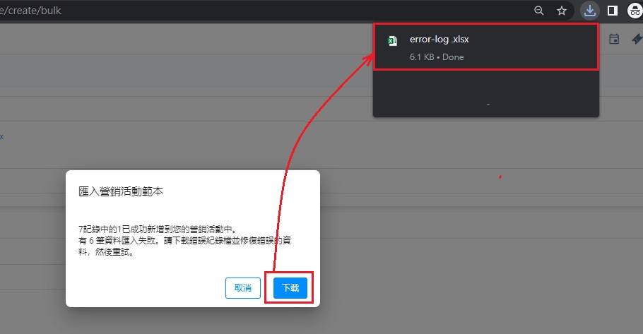 - 在彈出式視窗,點擊下載,以下載檔案error-log.csv。