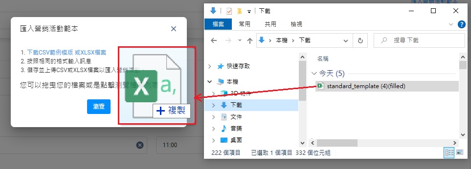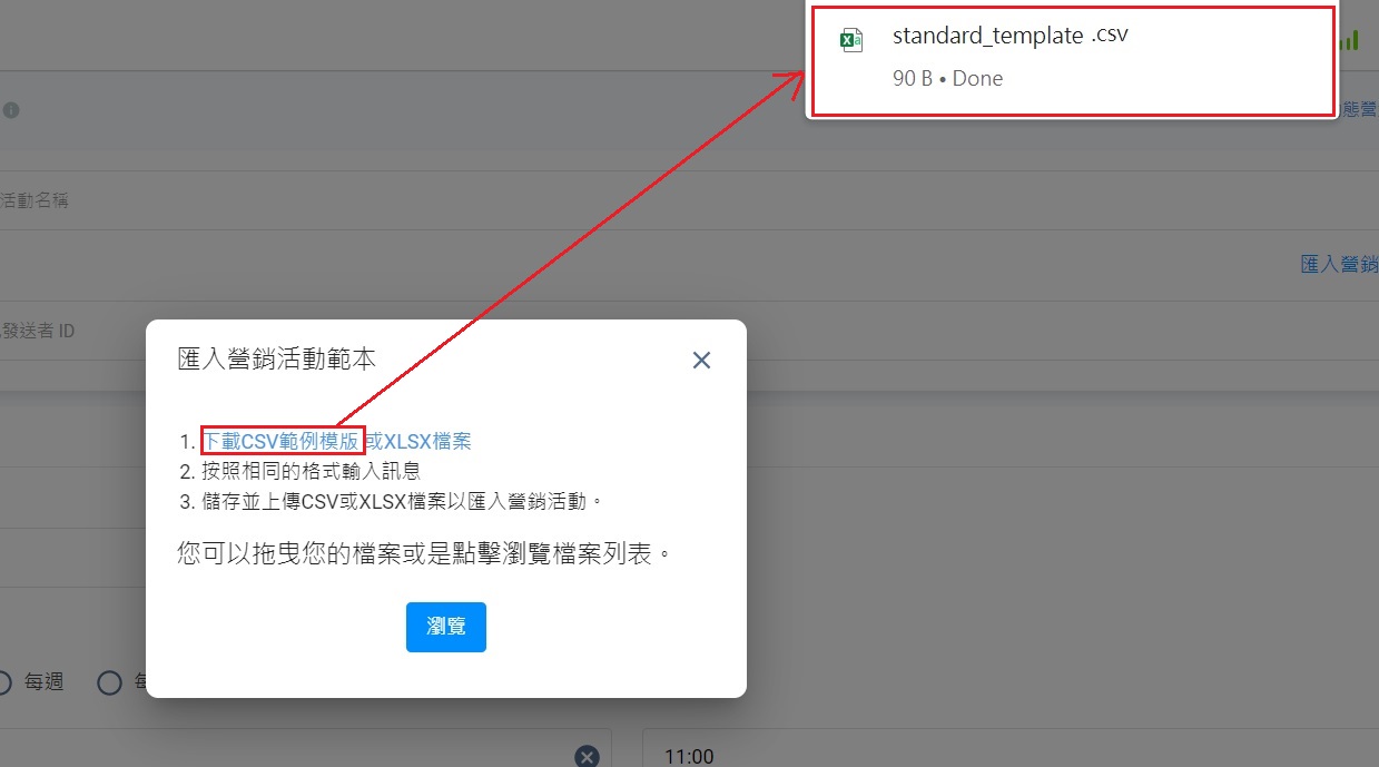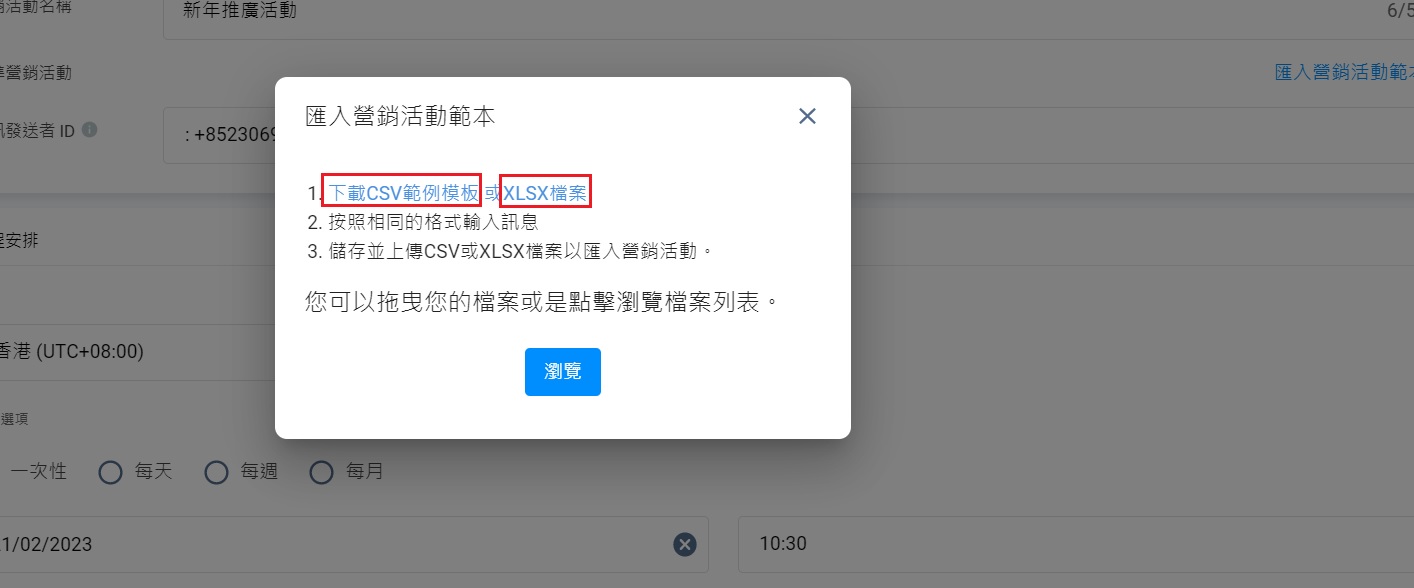 - 在彈出式視窗,點撃下載CSV範例模版或XLSX檔案,以下載範本。