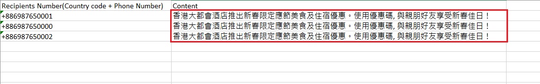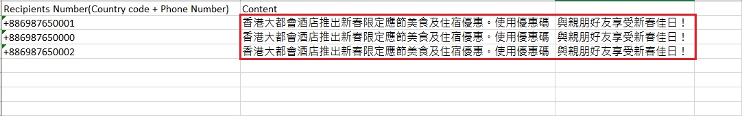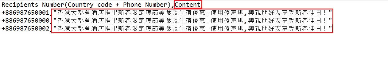 在含有逗號的文字加上開雙引號(“”),例如:“香港大都會酒店推出新春限定應節美食及住宿優惠。使用優惠碼, 與親朋好友享受新春佳日!” ,並將其檔案儲存為CSV檔案上載。