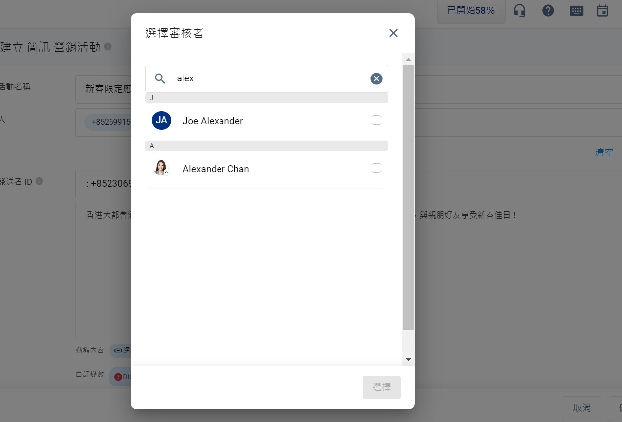 - 勾選審核員後,點擊選擇。CINNOX聊天機器人和電子郵件,會提醒審核員,該營銷活動有待他們審核。