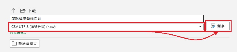 以CSV URF-8 (逗號分隔) (*.csv) 格式儲存檔案。