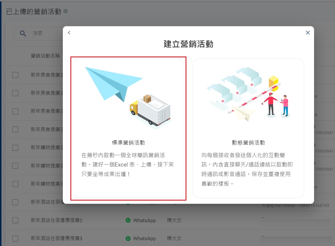 - 在建立營銷活動的彈出式視窗,選擇簡訊。