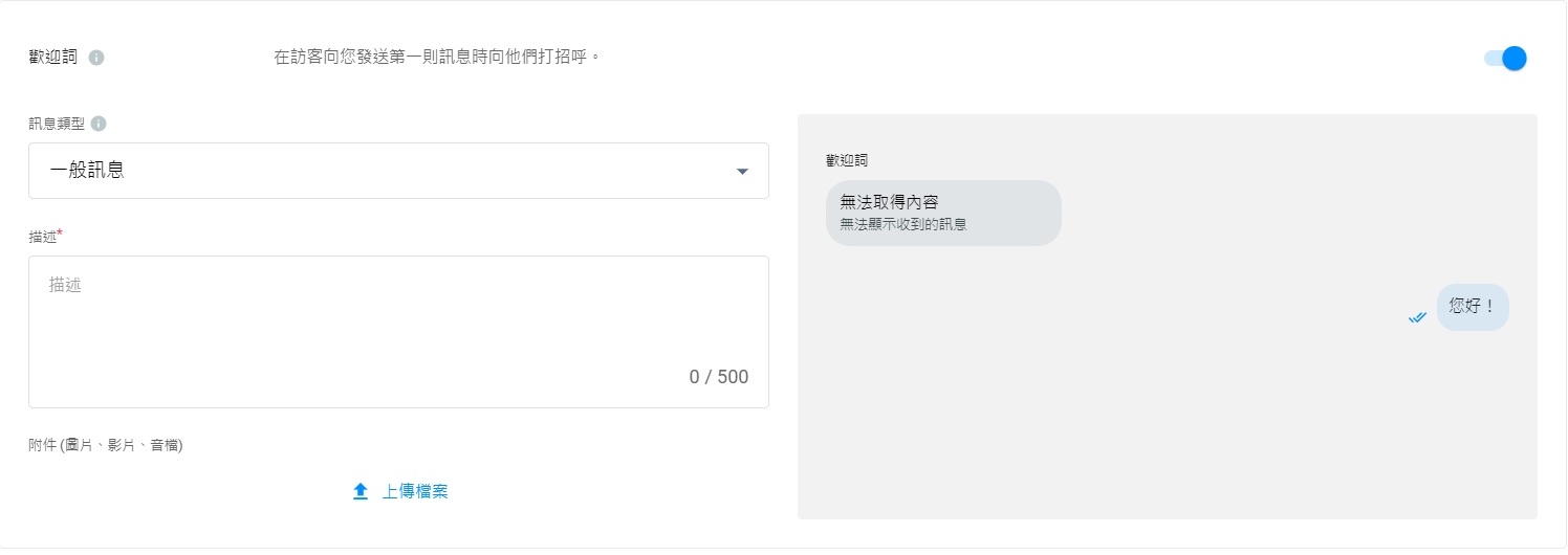 - 歡迎詞:當訪客發送他們第一項訊息時,你向他們打招呼的訊息。
