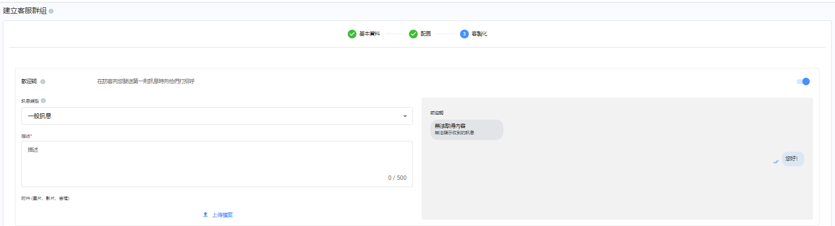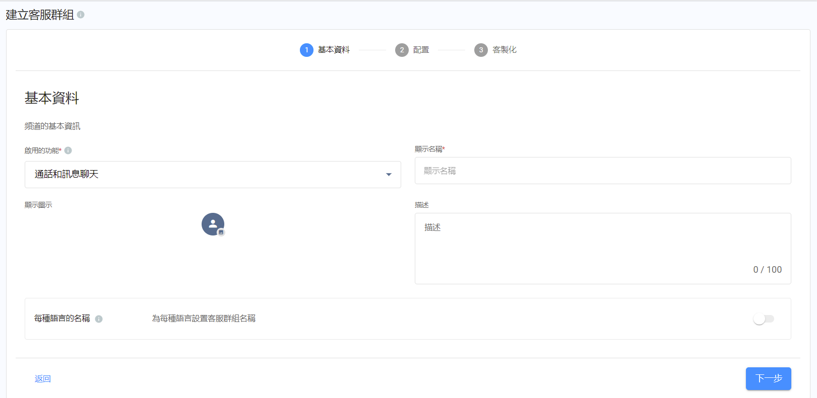 - 上載客服群組圖示,輸入其顯示名稱和描述(可選擇不填)。