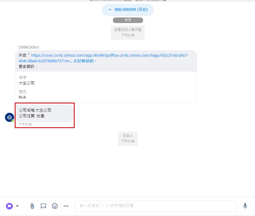 - 頻道客製資訊顯示在聊天室部分的員工側,用於聊天諮詢。