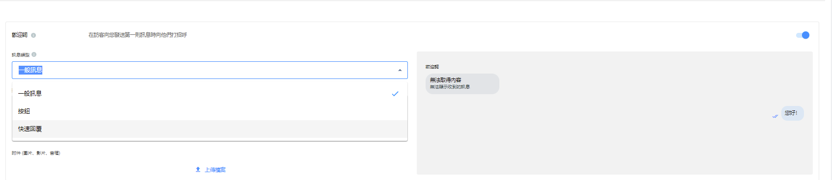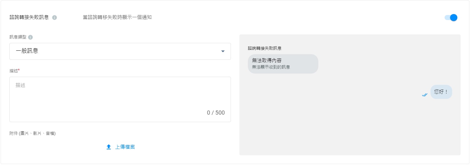 - 選擇諮詢轉接失敗訊息的類型,包括:一般訊息、按鈕或快速回覆。