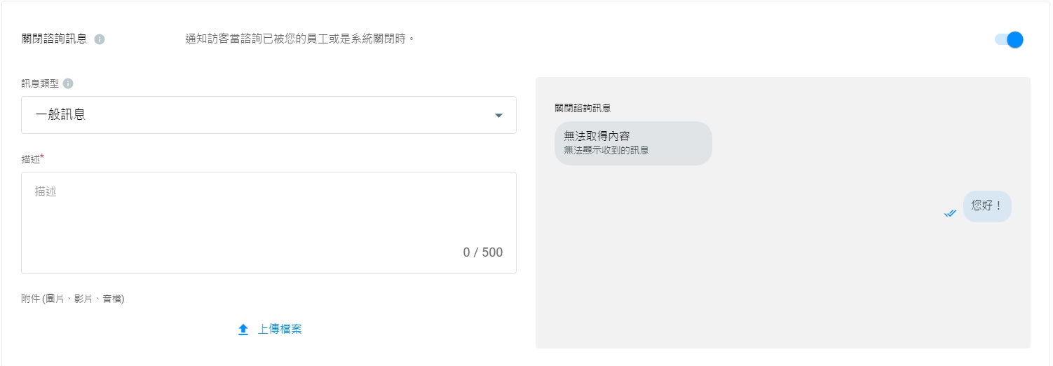 - 關閉諮詢訊息:當員工或系統結束諮詢時,通知訪客的訊息。