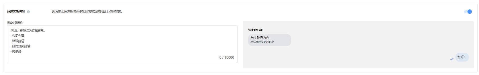 - 頻道客製資訊的字元數目上限為10,000個。如果資訊的字元數目超過上限,聊天機器人不會發送該資訊。