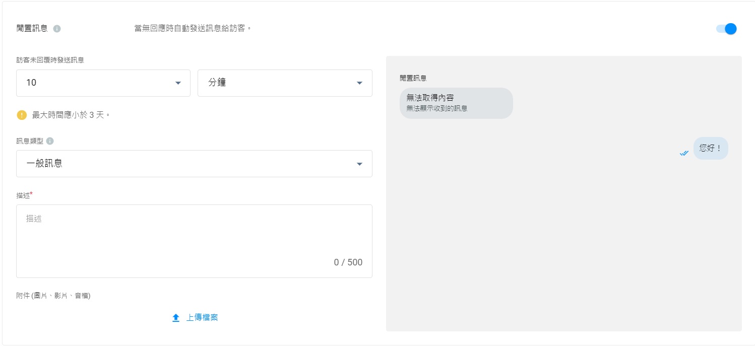 - 當訪客在設定時間後無回應,系統會自動發送閒置訊息予訪客(以分鐘或小時為單位)。