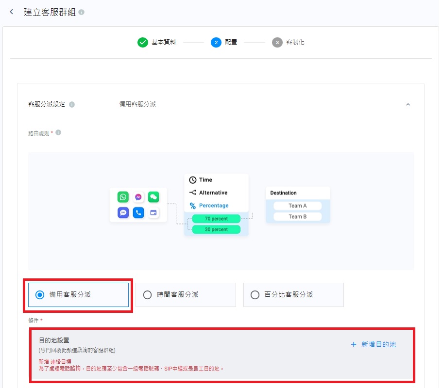 有關客服分派的詳細資料,請查看備用、百分比、時間客服分派路由和熟客客服分派部份。