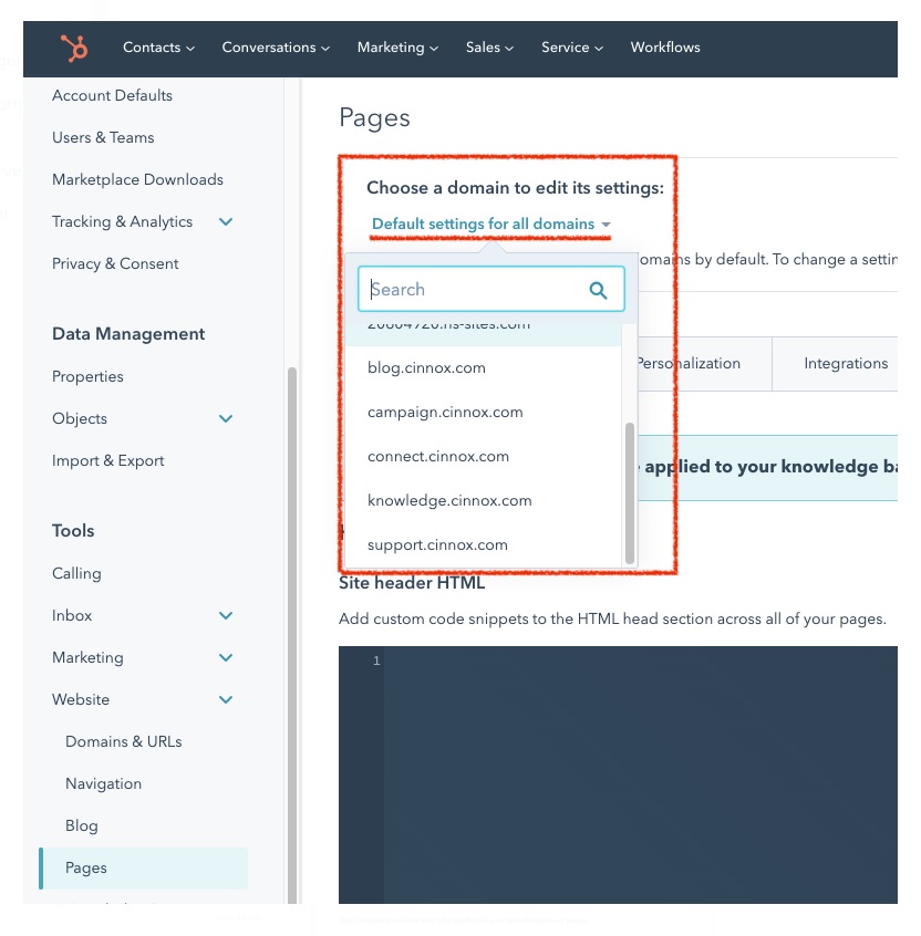 - 在Pages的頁面,於Choose a domain to edit its settings:中,選擇安裝CINNOX懸浮圖標的Domain。