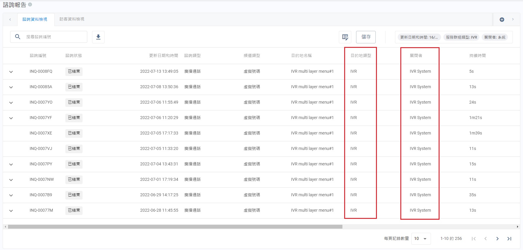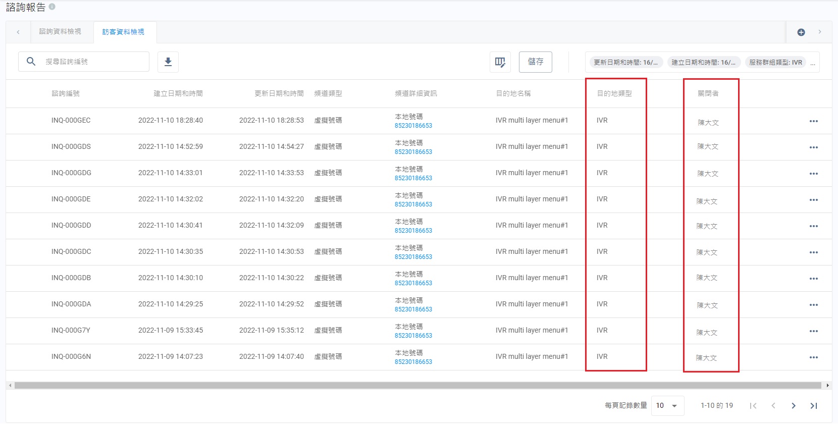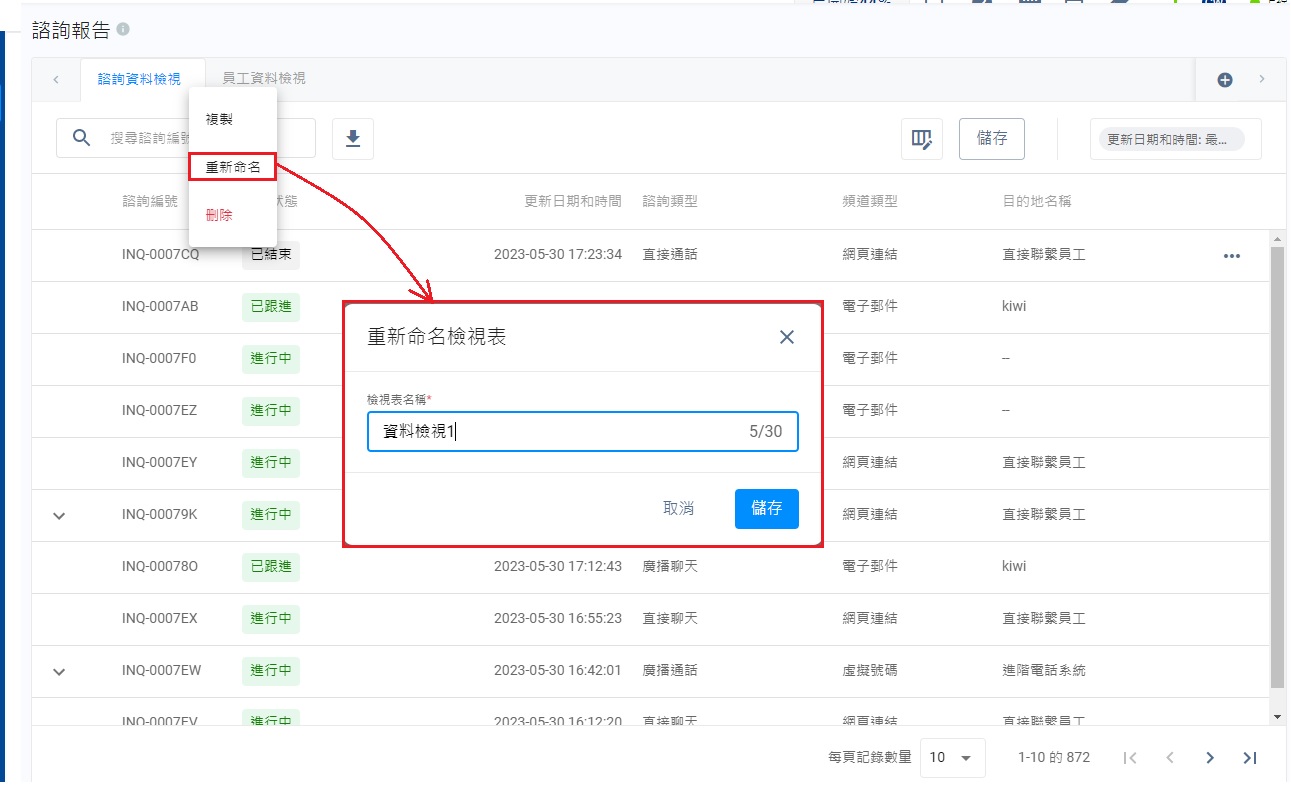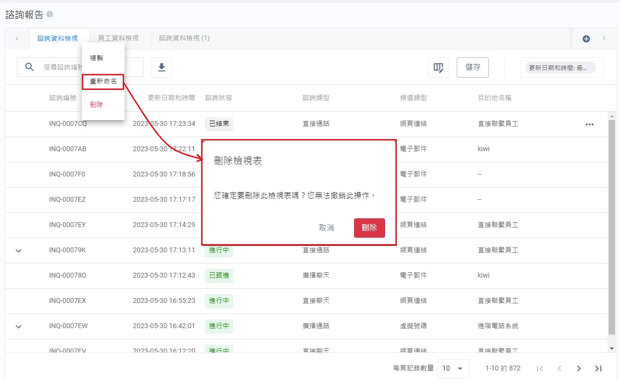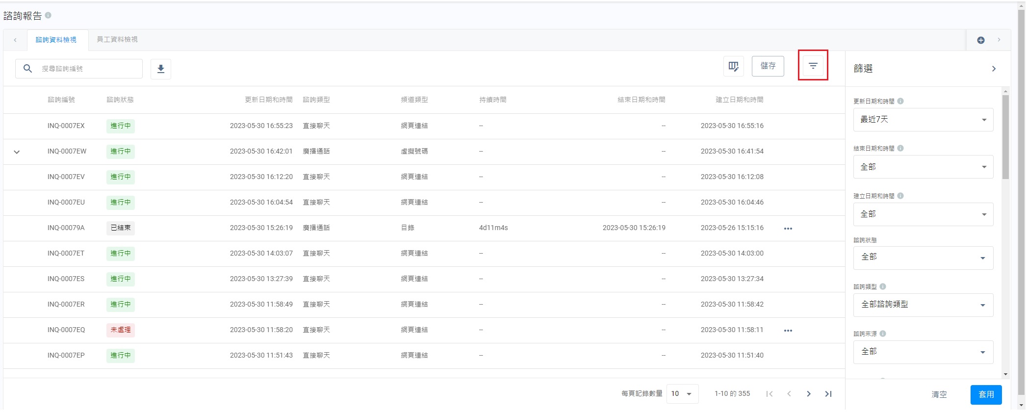 列表上的諮詢記錄,會根據選擇的篩選條件而調整。