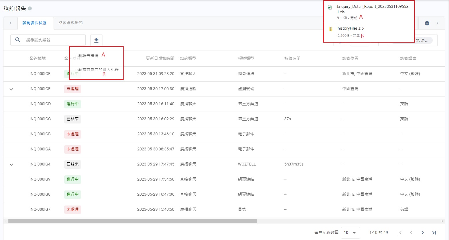 B. 下載當前頁面的聊天記錄 - 以Zip檔案形式下載當前頁面上每個諮詢的聊天記錄。每個諮詢的聊天記錄會獨立儲存於一個Excel (XLS)檔案內。
