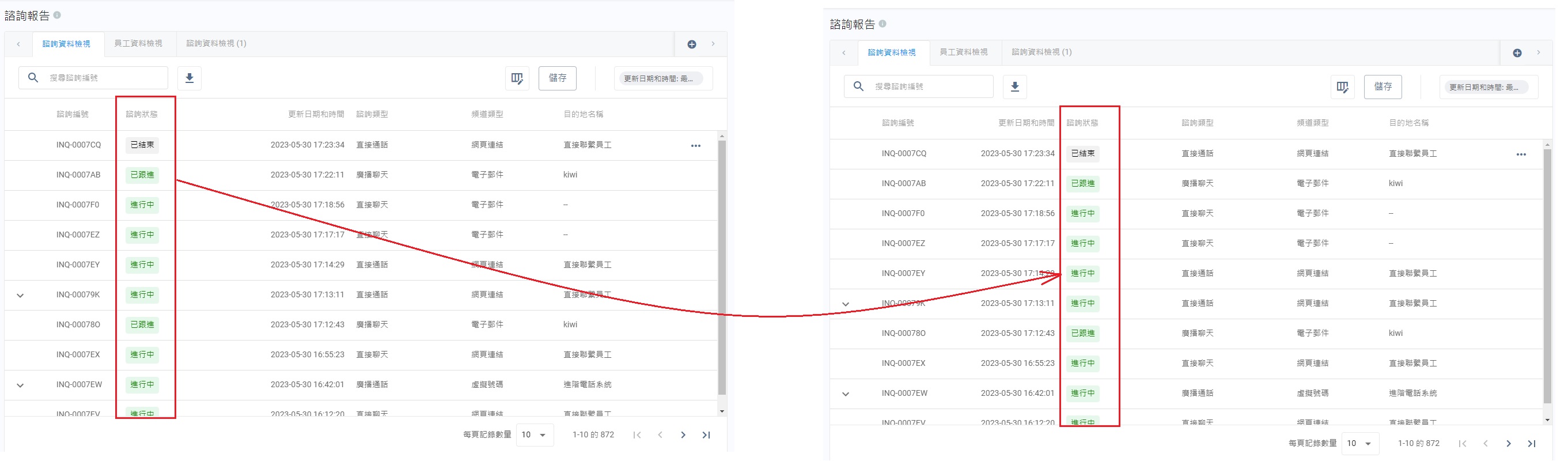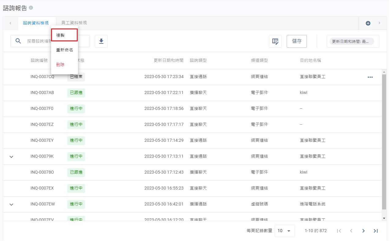 | 諮詢狀態 | 諮詢狀態包括:待處理、處理中(進行中或跟進中)、未處理以及已結束。 |