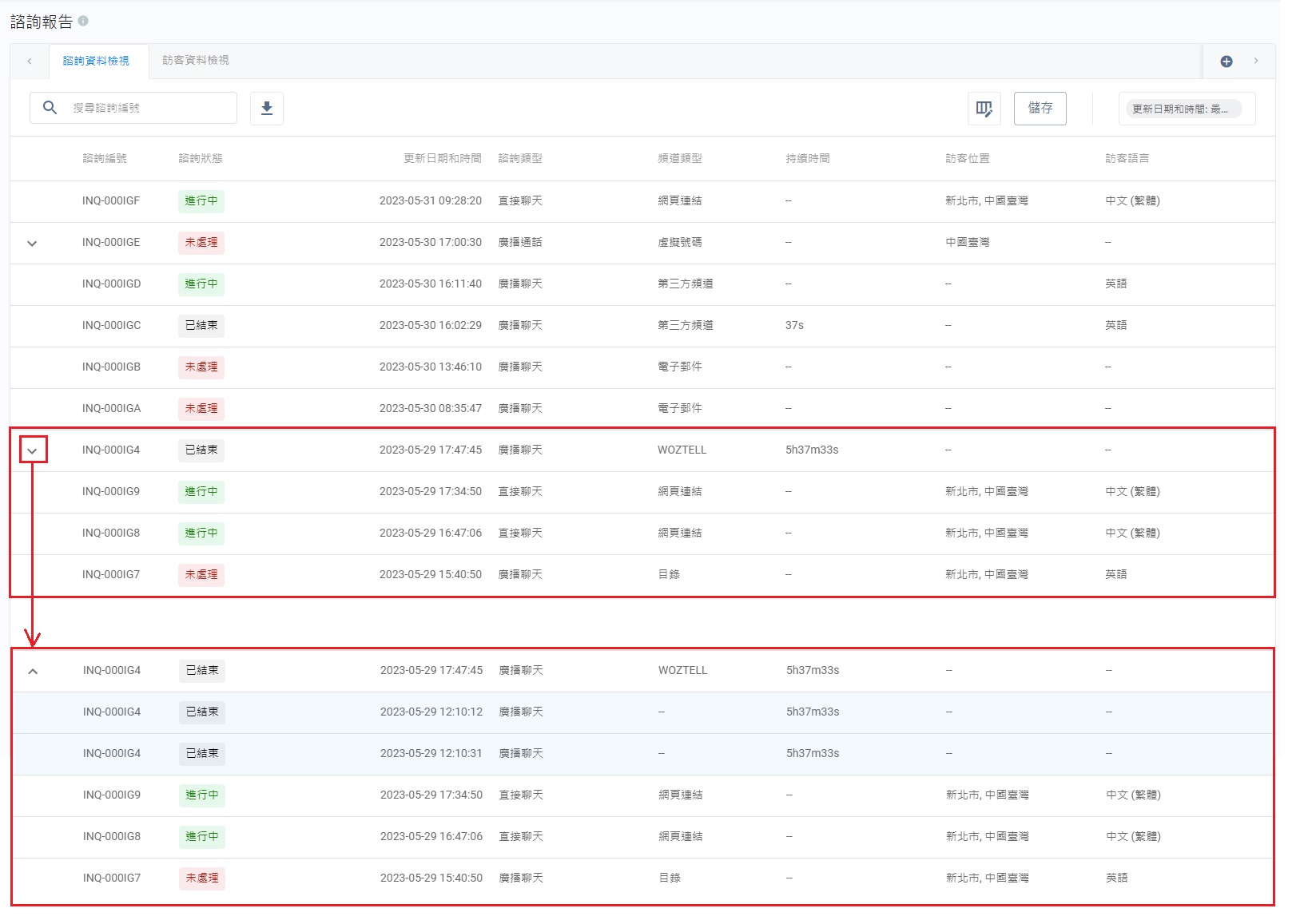 當你點擊位於記錄表最左邊的 ⬇️時,進行中和未處理的諮詢的細項會被展開。