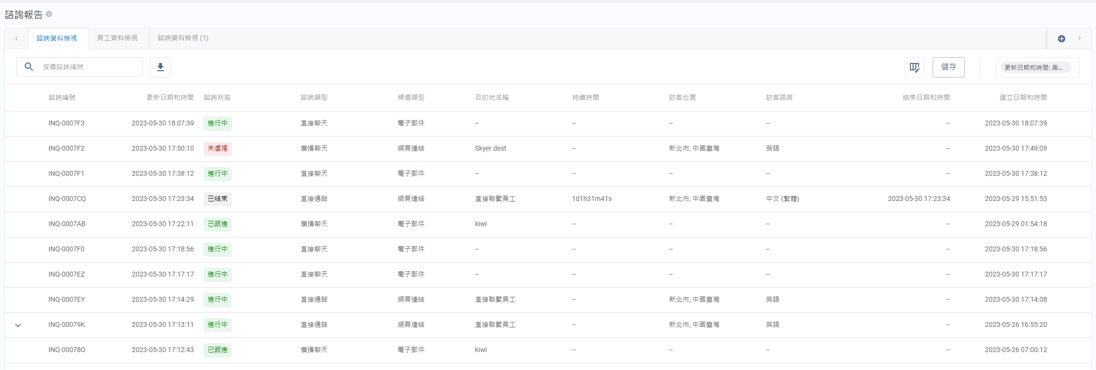 這些關於諮詢的字段包括:諮詢狀態、建立日期和時間、結束日期和時間、目的地資料包括其終端,以及處理訪客諮詢的客服資料。此外,亦提供了訪客的相關資料,使你更掌握他們的情況。