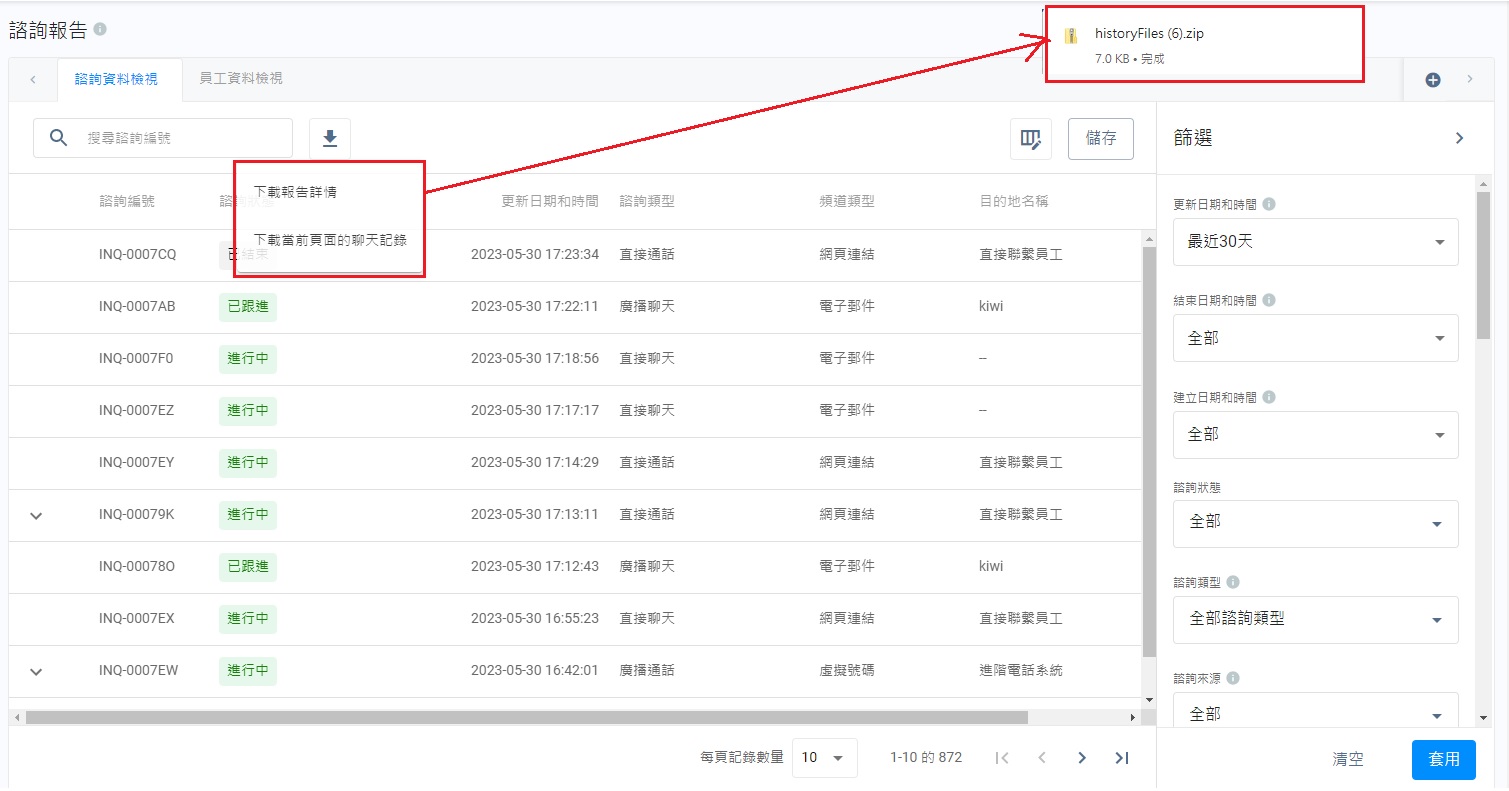 你可以在諮詢報告列表中,或在查詢頁面內的聊天室中,匯出已結束諮詢的對話記錄。