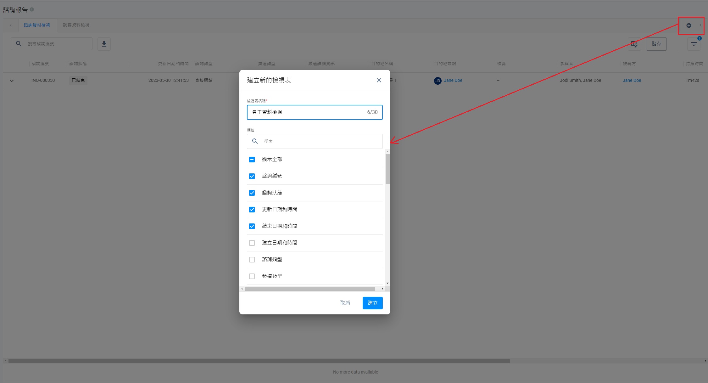 CINNOX提供基本的資料檢視。這個資料檢視分頁的欄位,顯示最近7天的諮詢資料。你可以根據預設資料,修改欄位和篩選條件。