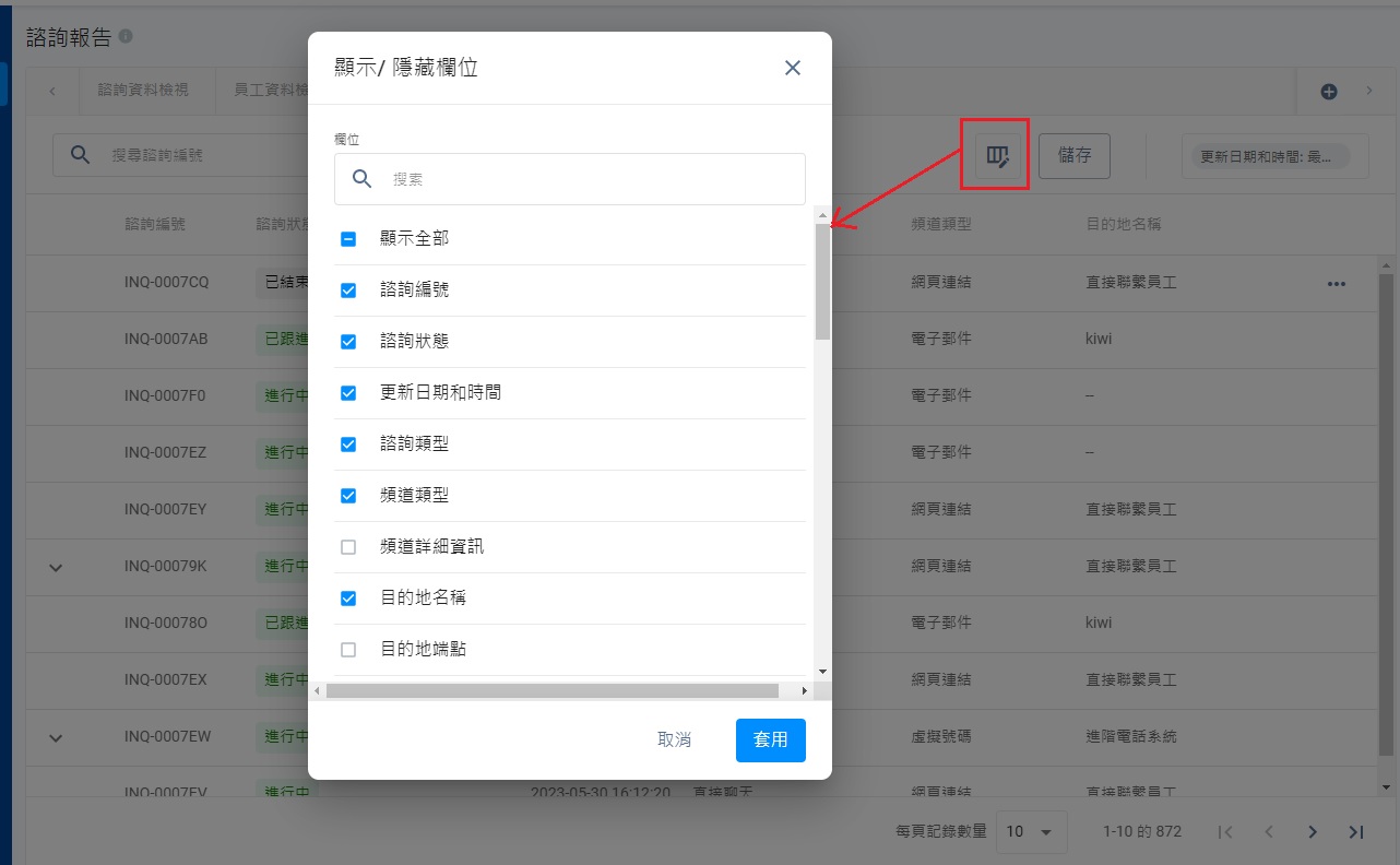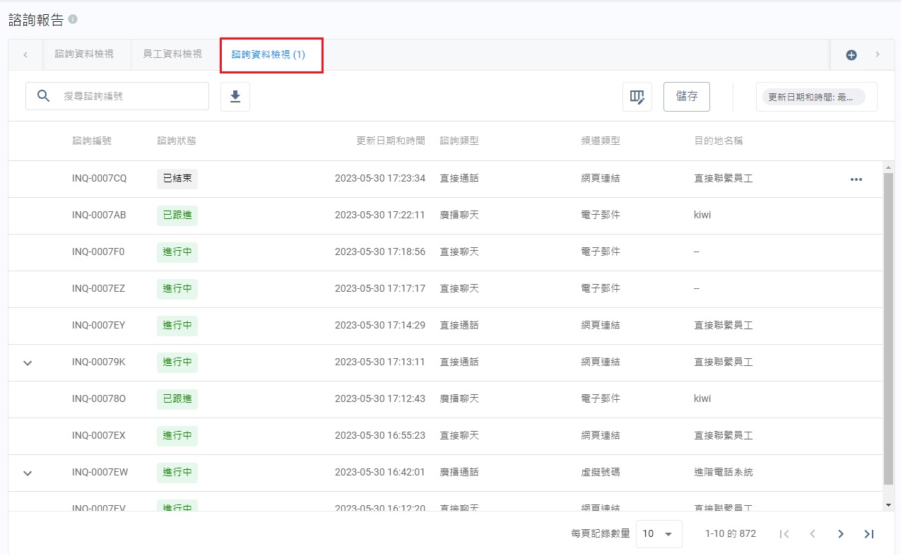 你可以根據需要,使用篩選器查看諮詢數據,從而在分頁顯示所需結果。