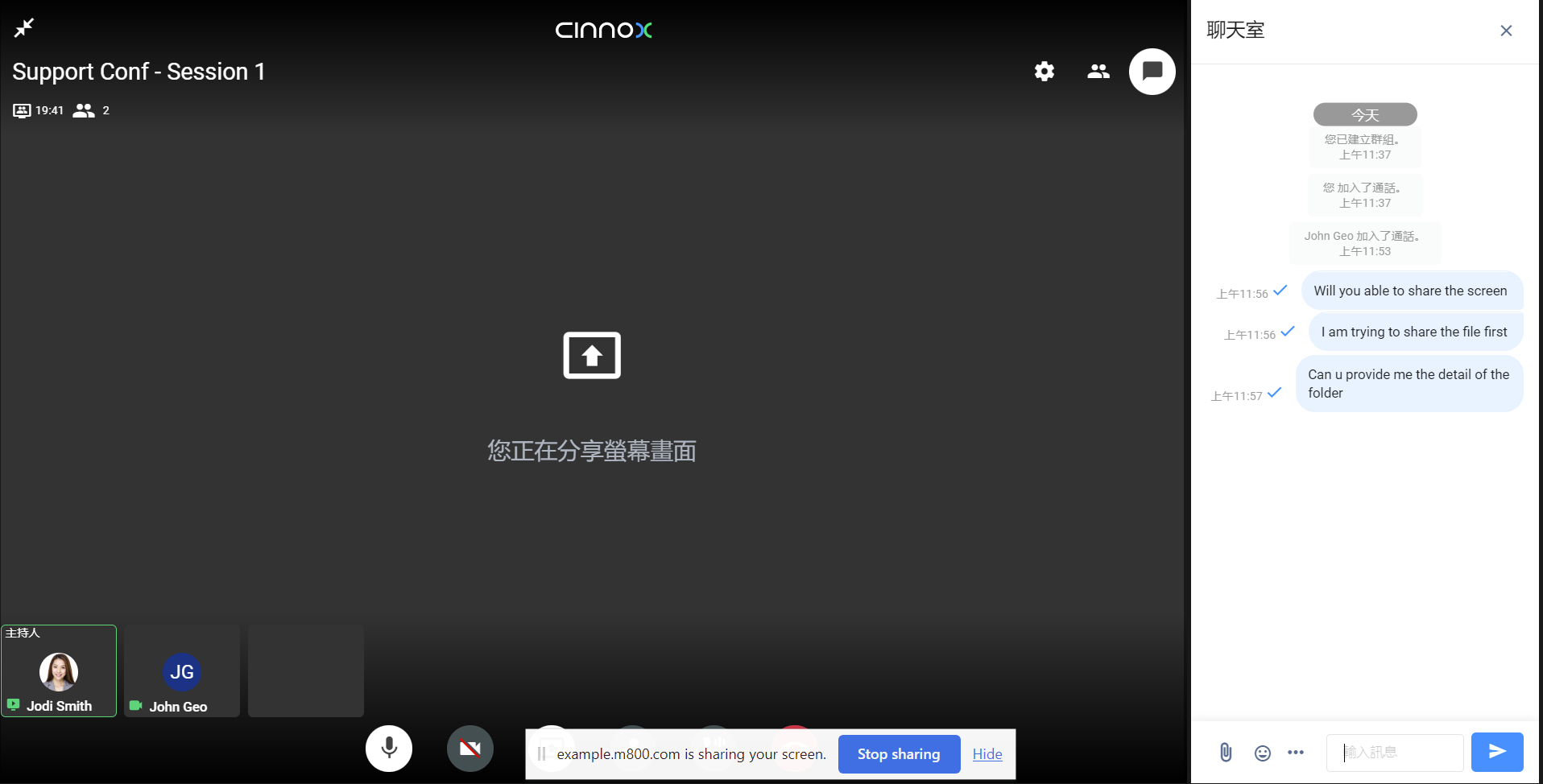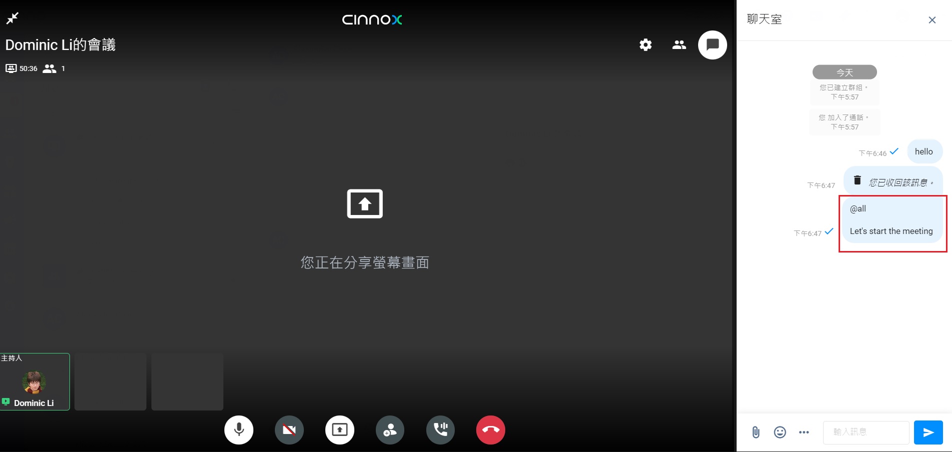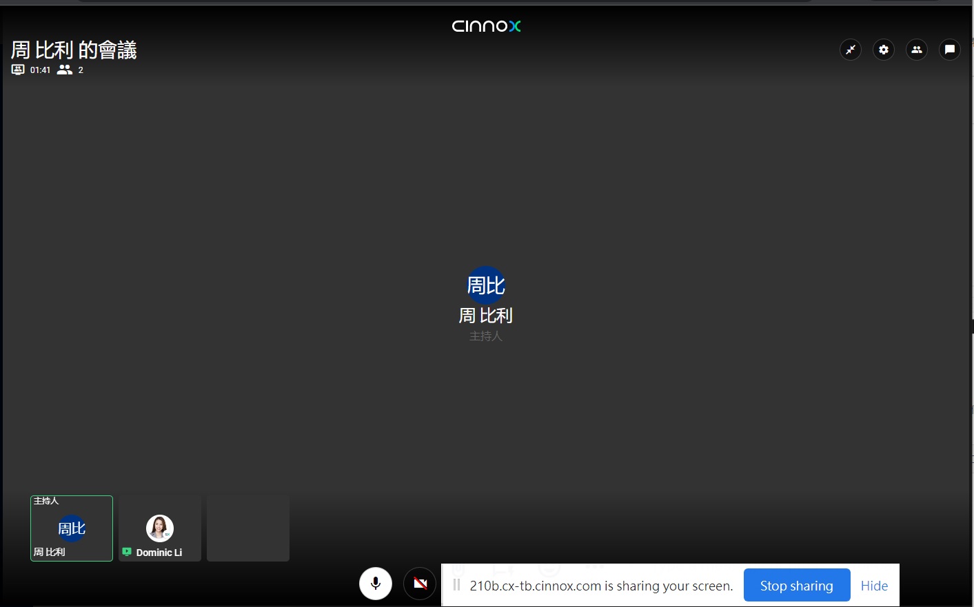 - 要停止分享你的螢幕,請再次點擊分享螢幕按鈕。如果其他成員,點擊他們分享螢幕按鈕,CINNOX 也會自動停止分享你的螢幕。