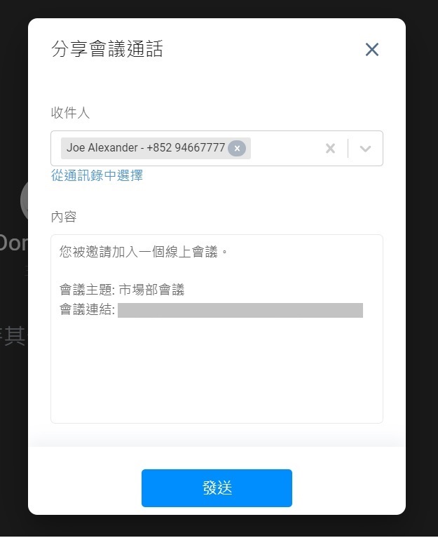 - 在將出現的 分享會議通話彈出式視窗中,輸入收件人的國家碼和電話號碼(例如:+85294667777)。你也可以從訪客或內部通訊錄選擇聯絡人。