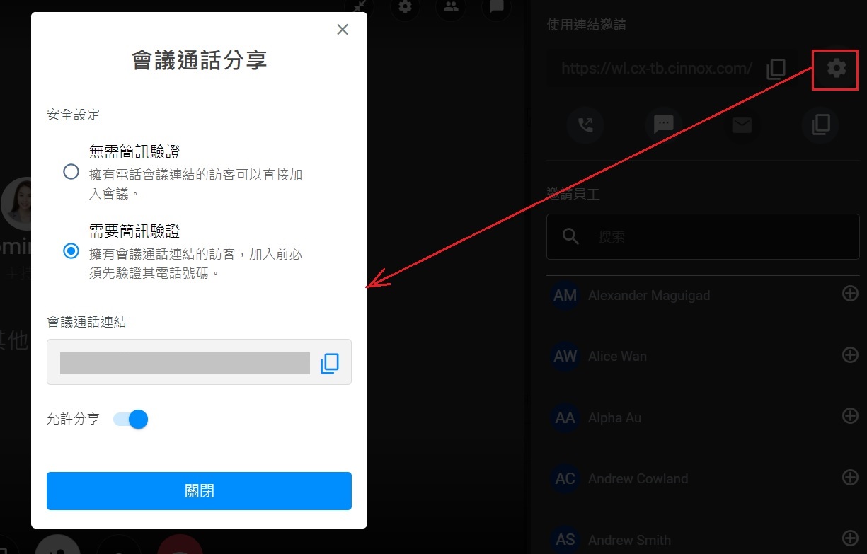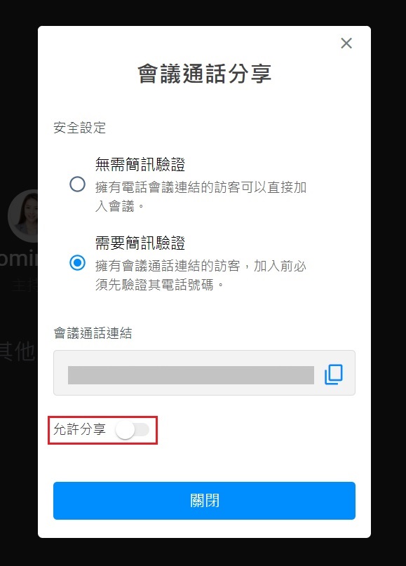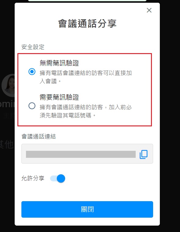 - 如有必要,在會議通話分享的彈出式視窗中,將設置切換為無需簡訊驗證。