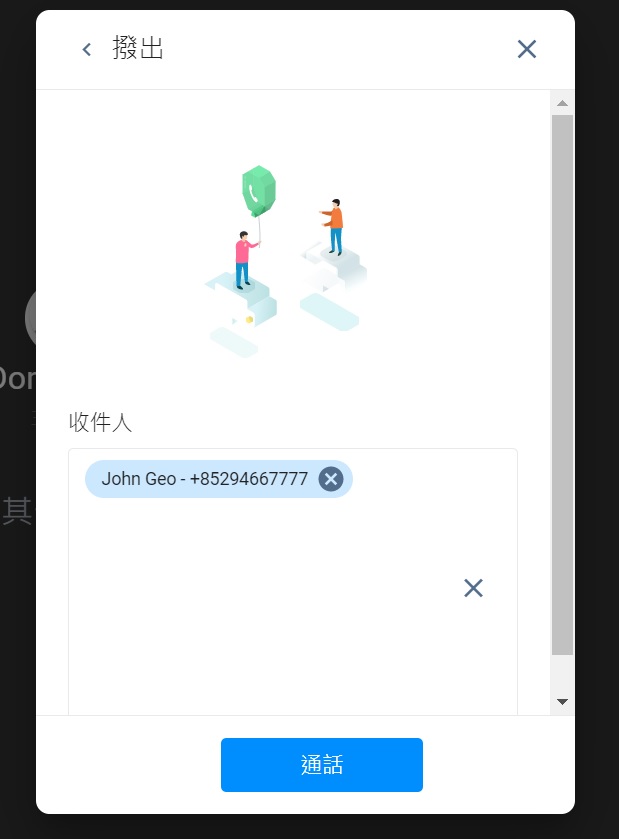 - 選擇數字鍵盤分頁。在彈出式視窗中,輸入國家碼和電話號碼(例如:+85294667777),然後點擊通話。你也可以從你的員工、外部聯絡人或SALESFORCE通訊錄選擇一個聯絡人。