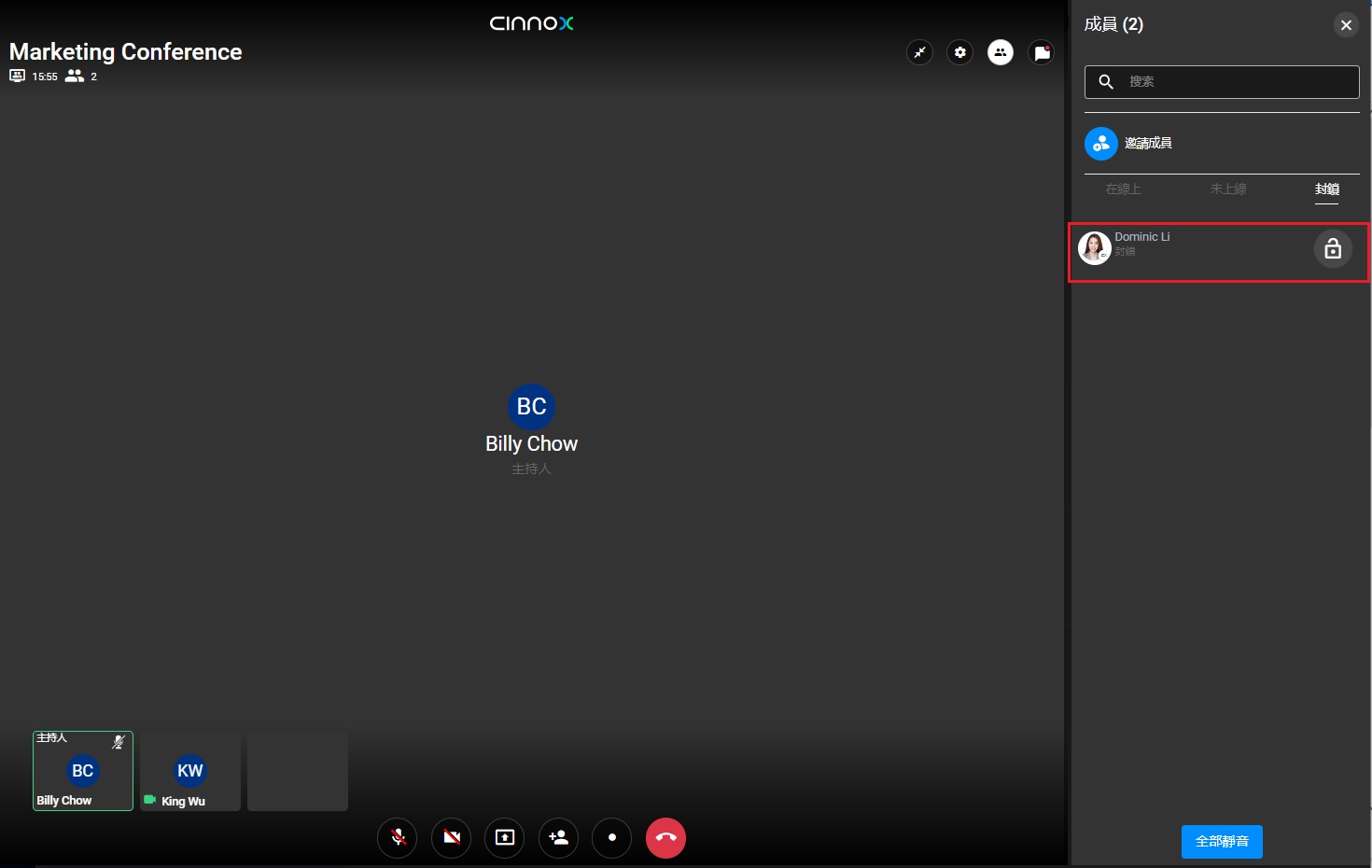- 在通話會議室,點擊成員圖標,查看成員名單。被封鎖的成員列於下方。