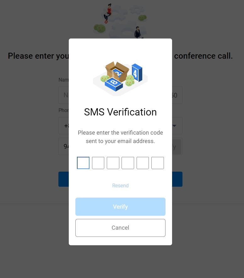 - 在你裝置的瀏覽器上的加入會議頁面上,輸入你的姓名和電話號碼,然後點擊驗證。