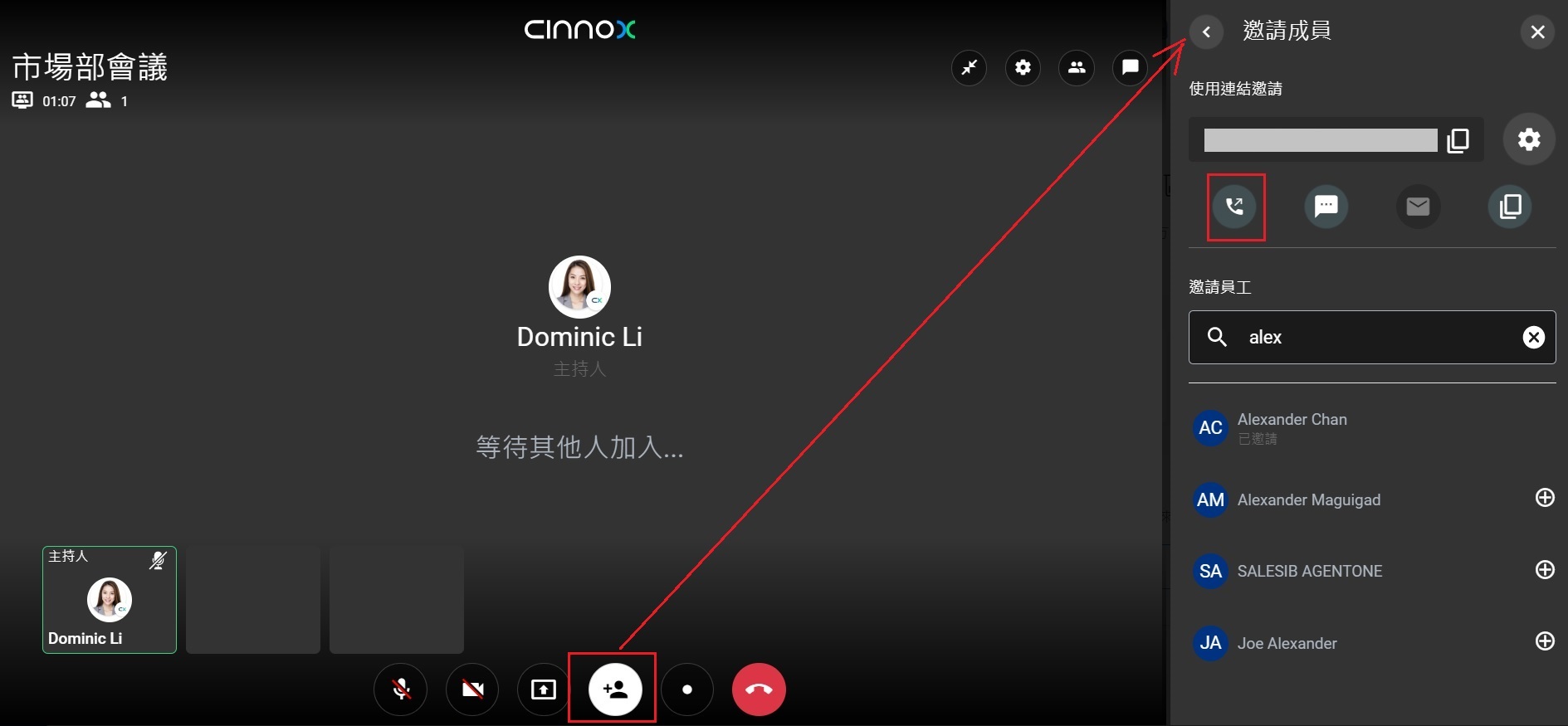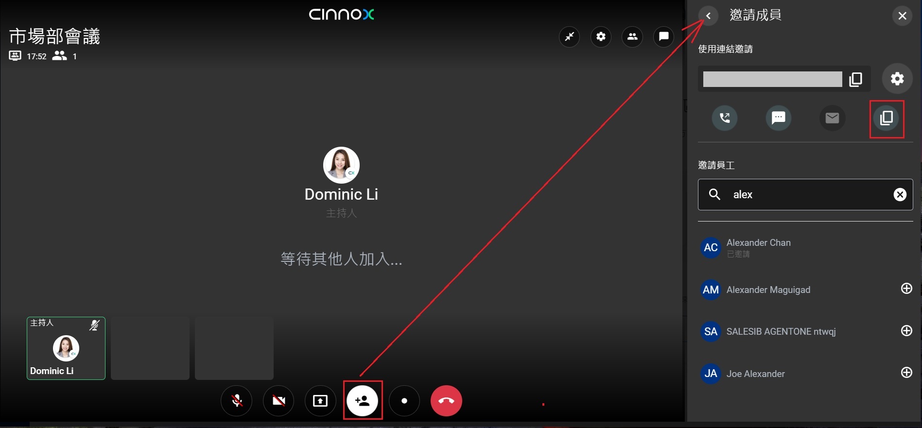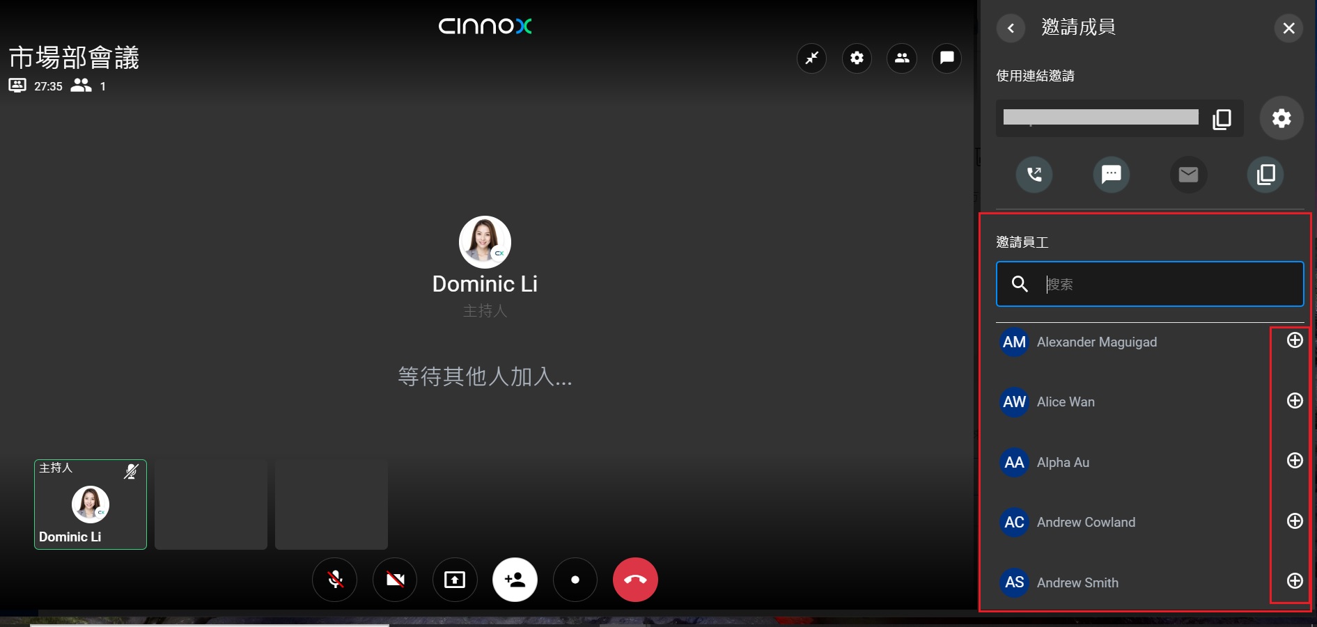 - CINNOX啟動通話會議室後,可以繼續邀請其他成員加入。有關詳細資料,請參閱邀請成員部份。
