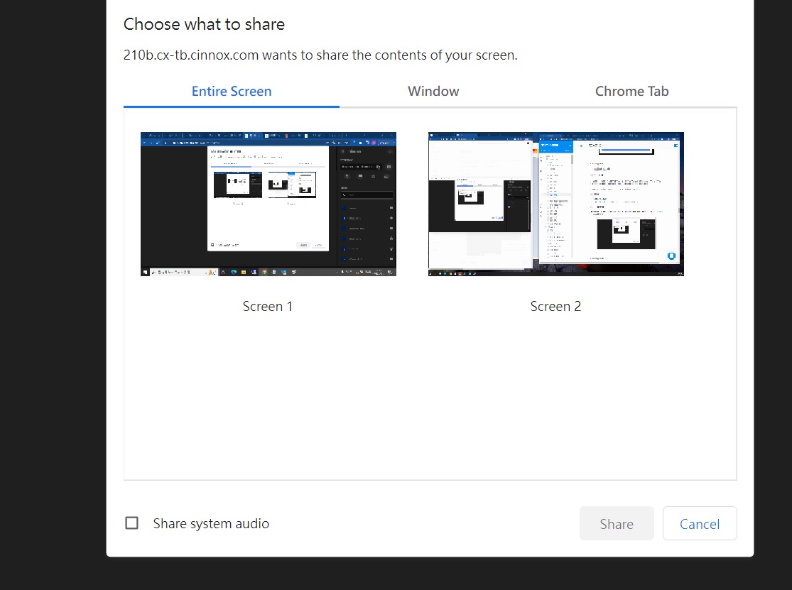 - 要分享你的螢幕,請點擊會議通話窗口底部的分享螢幕按鈕。你可以選擇分享Chrome分頁、視窗或整合螢幕畫面。所有成員都看到你的桌面螢幕。