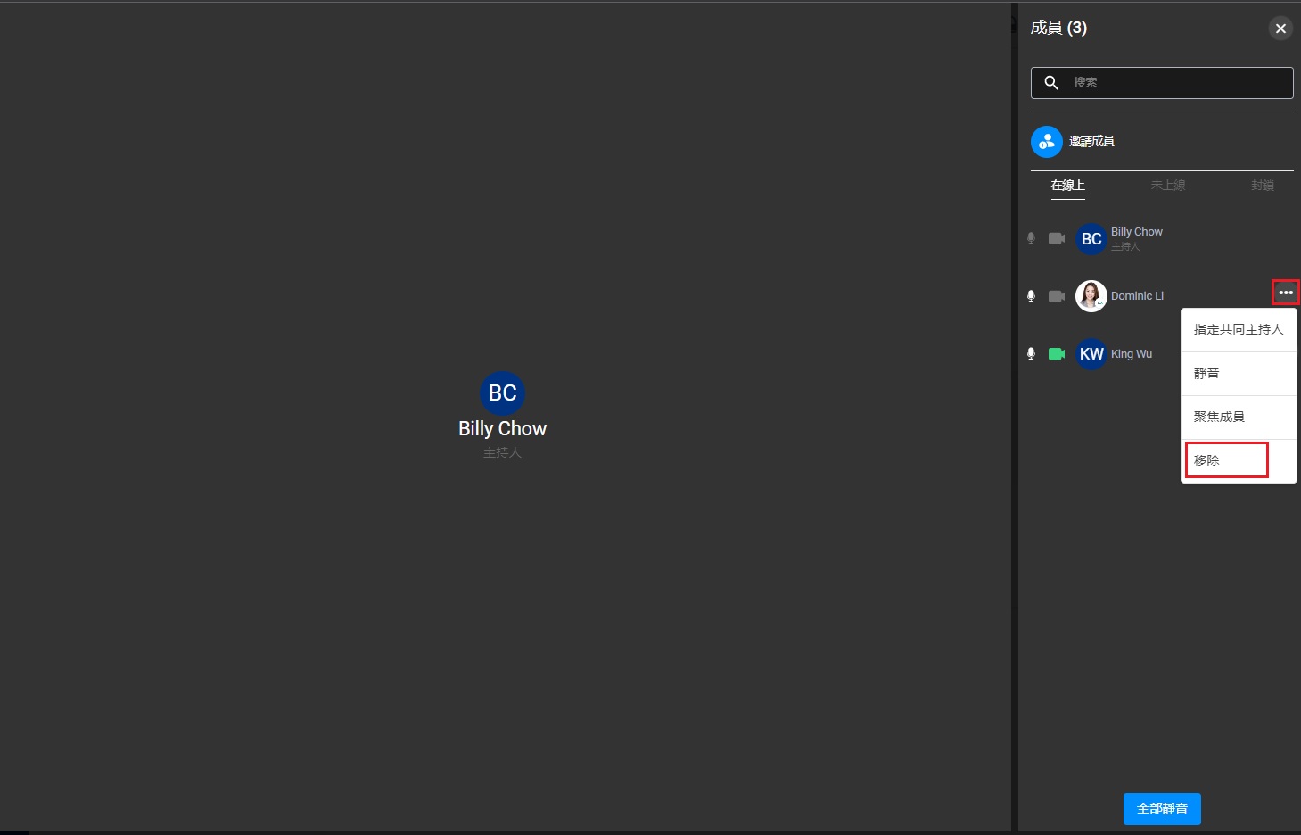 - 選擇在線上分頁,點擊靜音,靜音該成員。