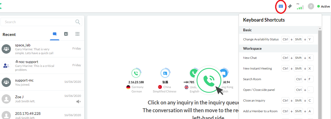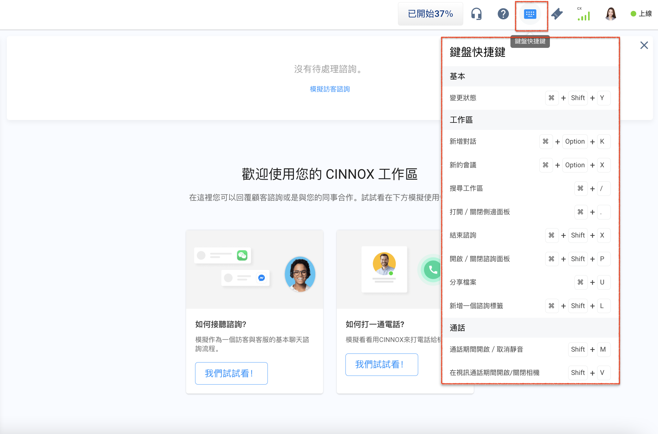 使用者可以容易地點擊不同圖示,導航到CINNOX平台的不同功能。但使用鍵盤快捷鍵(Keyboard Shortcuts)能更快使用平台上的功能。