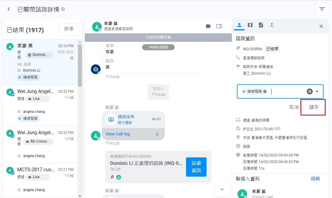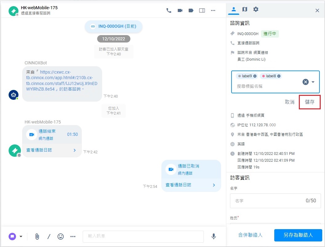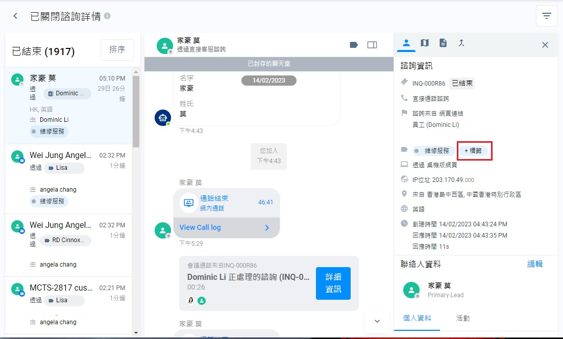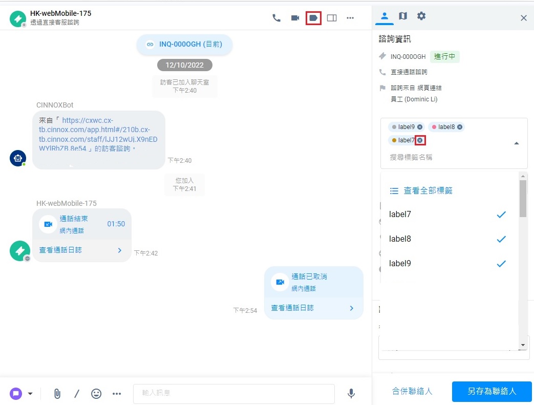 工作人員可以在諮詢總覽頁面加上諮詢標籤。對於任何狀態的諮詢,例如正在處理、未處理和已結束的諮詢,都可以加上標籤。