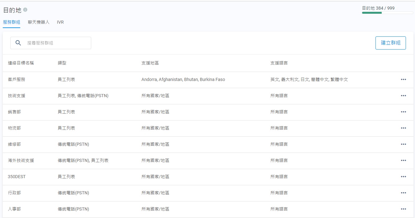目的地(Destination)包括:服務群組(Service Group)、聊天機器人(Chatbot)和互動語音回應(IVR),用來回答來自CINNOX的諮詢。設定目的地,協助支援團隊,管理和處理訪客和客戶的諮詢。