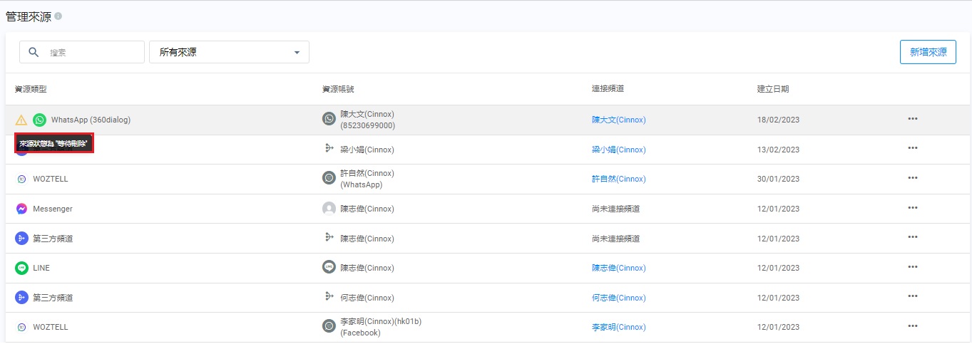- 當「來源狀態為「等待刪除」」時,您仍可如常使用該 360dialog 來源發出和接收訊息。