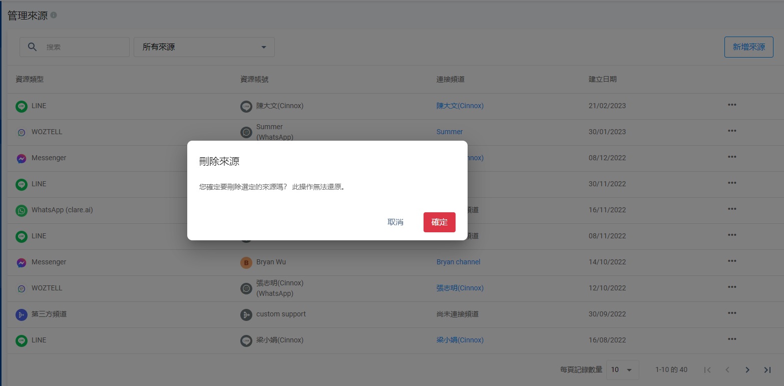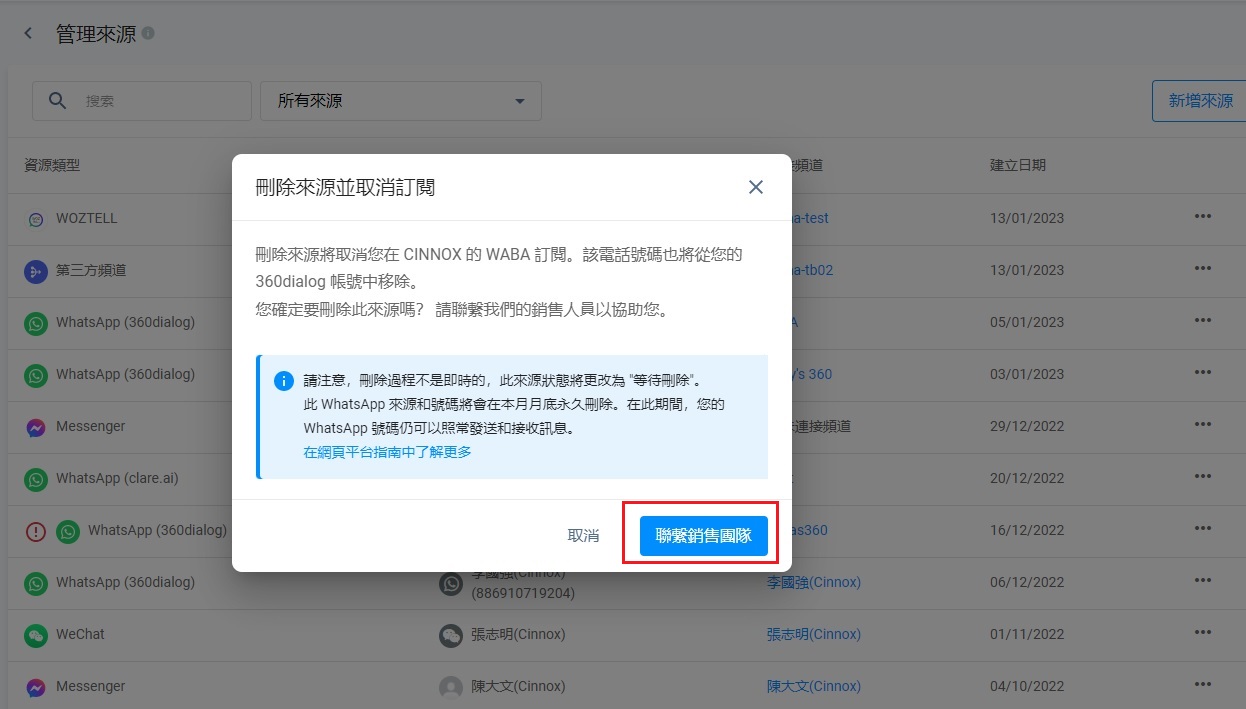 此 WhatsApp 來源和號碼將會在本月月底永久刪除。在此期間,您的 WhatsApp 號碼仍可以照常發送和接收訊息。刪除來源同時亦會取消訂閱 CINNOX 服務的 WhatsApp 商業帳號。電話號碼會從您的 360dialog 帳號移除。