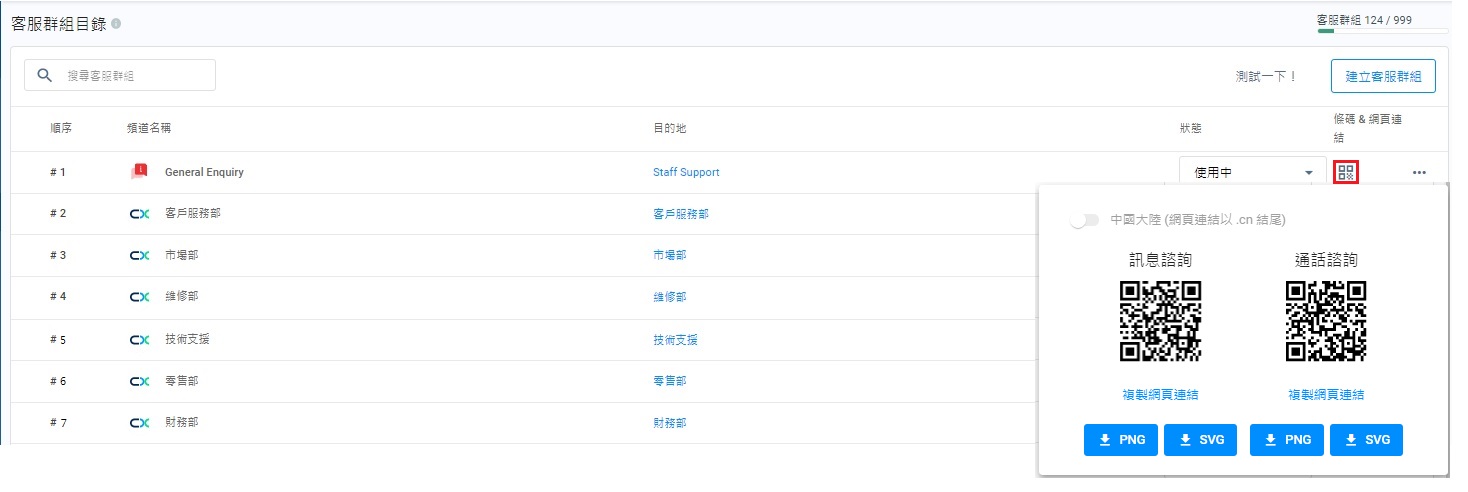 要分享客服群組二維條碼予員工和客戶,可在訪客接觸的網頁或其他渠道上提供,以便他們下載和保存其PNG 或SVG格式檔。分享客服群組網頁連接,只需複製其URL便可。