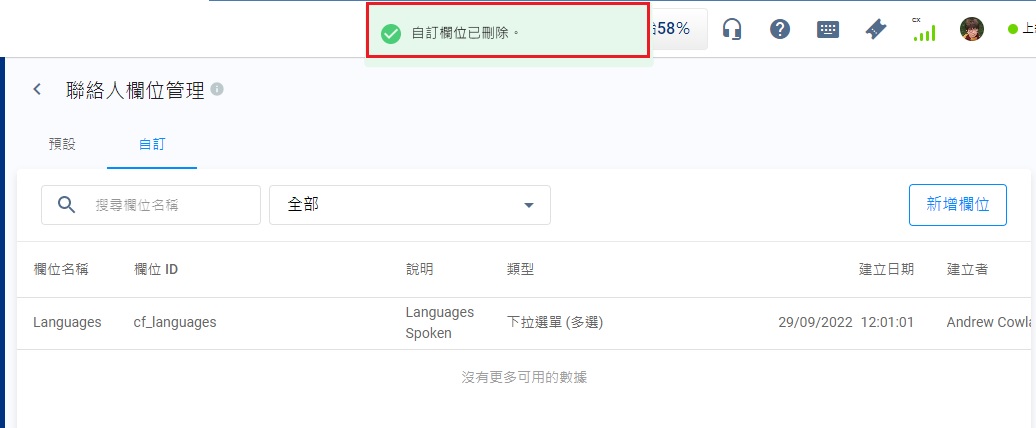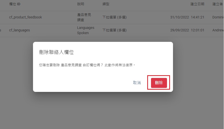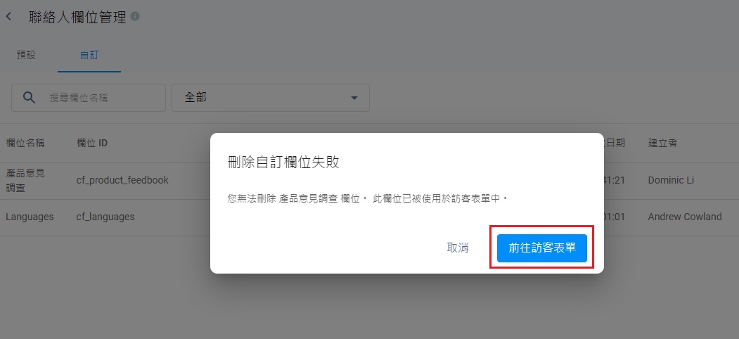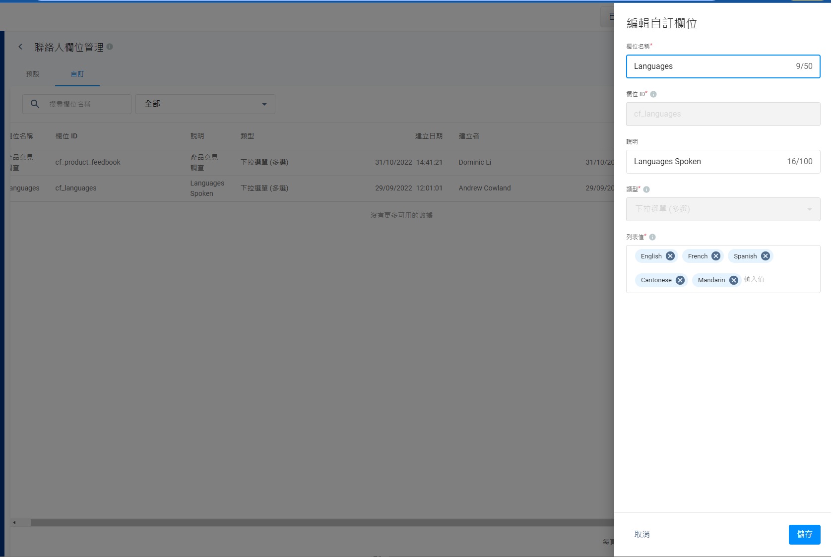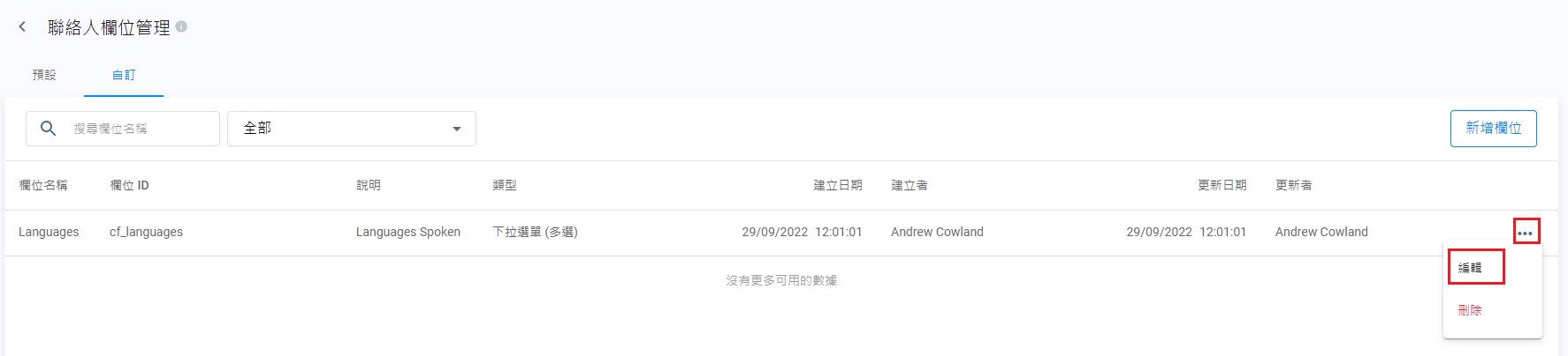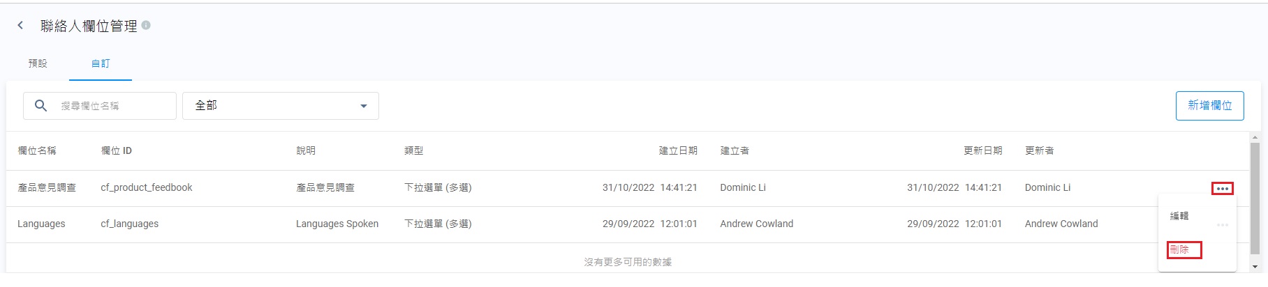 - 不能編輯自訂欄位的類型和欄位 ID。