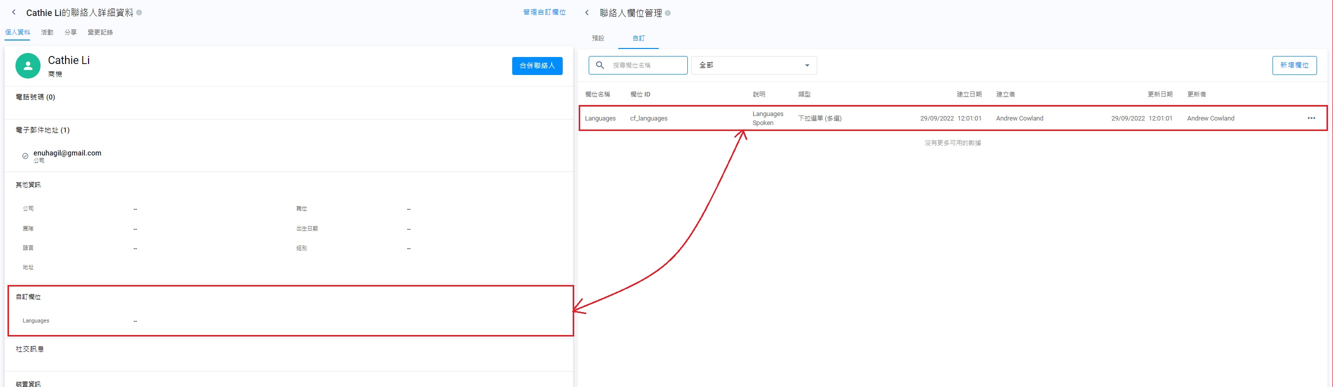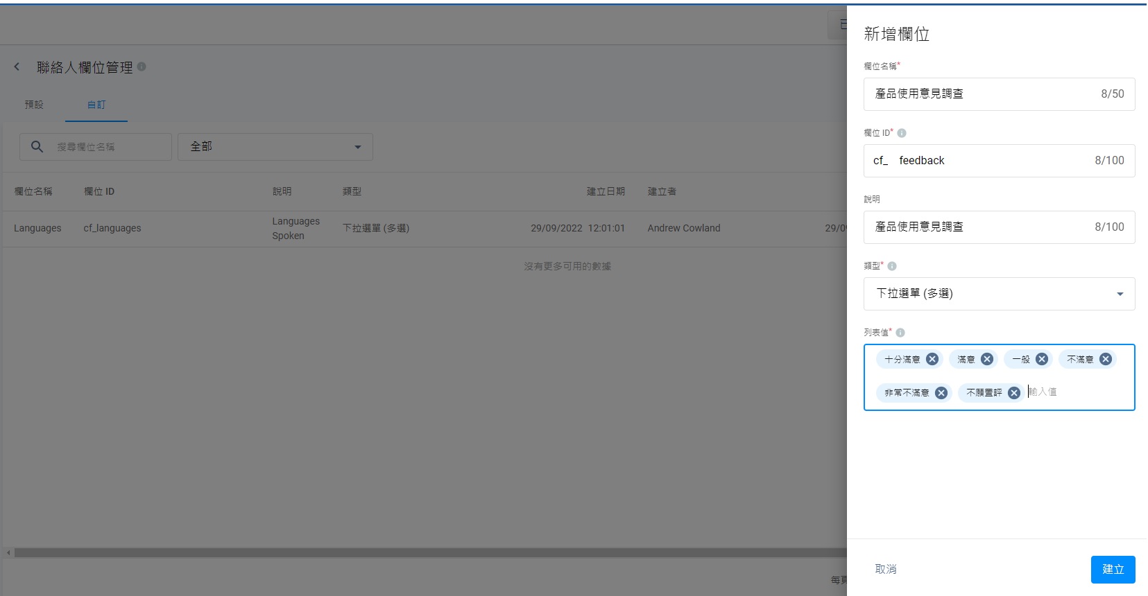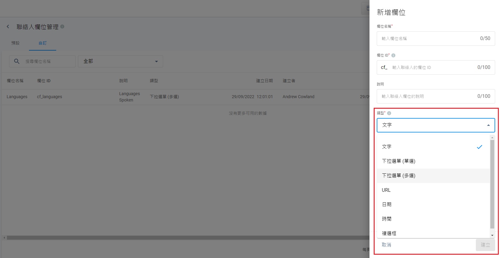 藉自訂欄位這功能,你可以新增欄位、收集不同的資料,類型包括:商機、展望、客戶和其他,以建立聯絡人記錄。你可以利用這些收集回來的資料,作組織營運和客戶互動之用。