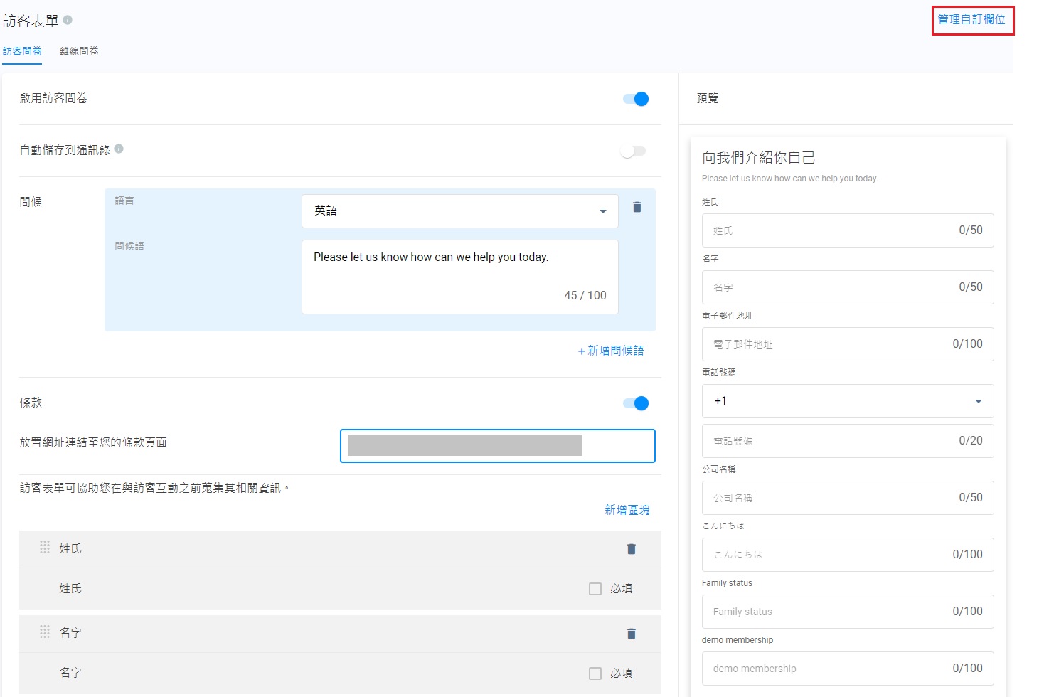 - 你可以在不同地方,包括:聊天室的訪客資訊、訪客表單,以及在平台連接時,使用自訂欄位功能,藉此,更快更有效率處理更多來自諮詢的資料。